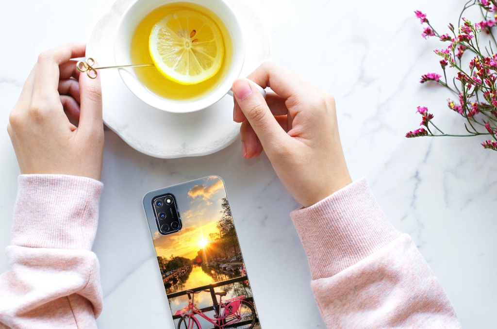 Amsterdam is meer dan ooit een toeristische trekpleister. Een bezoek aan de hoofdstad is niet compleet als je niet aanlegt bij de Amsterdamse Grachten. Ze zijn een symbool van de stad en hebben een enorme culturele en historische waarde. Daarom kunnen ze natuurlijk niet ontbreken in onze collectie design hoesjes. Dit schitterende design hoesje met Amsterdamse grachten tref je enkel en alleen aan bij B2C Telecom. De ondergaande zon en de fleurige en fraaie bloempakketten zorgen voor een prachtig totaalplaatje. Amsterdam is wereldberoemd om haar prachtige grachten uit de zeventiende eeuw. Dit smartphone hoesje is hier een eerbetoon aan. Het design staat op een TPU case. Dit OPPO A52 | A72 Siliconen Back Cover wordt alleen aan de bovenkant bedrukt en is zeer flexibel. De randen van het hoesje blijven transparant.
