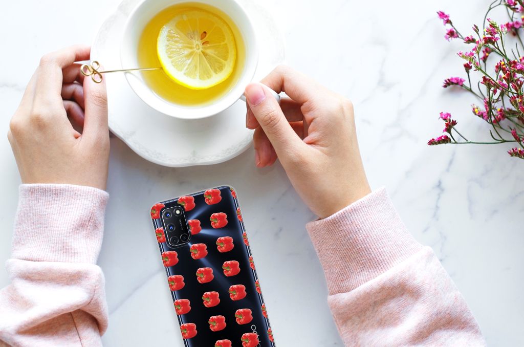 Er zit pit in jouw OPPO A52 | A72 Siliconen Case dankzij dit design met rode paprika’s. Paprika’s zijn er in allerlei kleuren en vormen en ze hebben gemeen dat ze heel erg gezond zijn. De rode paprika’s op deze case staan op een grijs met witte geblokte achtergrond en vormen een opvallende verschijning. Heb jij ooit iemand in je nabije omgeving rond zien lopen met een design hoesje met rode paprika’s? Waarschijnlijk niet. Dit hoesje wordt alleen aan de bovenkant bedrukt met paprika’s en is zeer flexibel. De randen van het hoesje blijven transparant en worden niet bedrukt. Met dit hoesje past jouw telefoon altijd in je broekzak. Zeker weten dat je met dit hoesje met rode paprika’s een smartphone accessoire te pakken hebt waarmee je jezelf in de schijnwerpers zet. Als je andere kleuren paprika’s op je hoesje wilt, raden we je aan ons assortiment design hoesjes te bekijken of zelf een hoesje te ontwerpen.