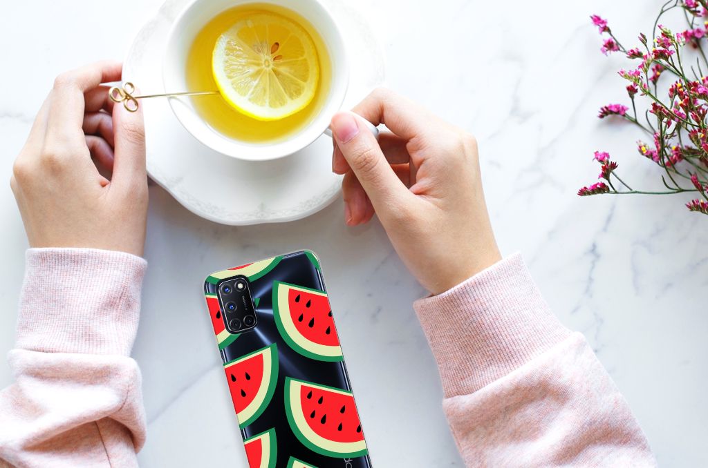 Watermeloenen zijn uitstekende dorstlessers, misschien dat je daarom juist in de zomermaanden extra enthousiast raakt van dit design hoesje Watermelons. Jij blijft gezond als je zo nu en dan een watermeloen neemt, jouw smartphone blijft in tact als je er deze OPPO A52 | A72 Siliconen Case omheen doet. Deze tpu case wordt alleen aan de bovenkant bedrukt met watermeloenen is zeer flexibel. De randen van het hoesje blijven transparant. Je kunt ook kiezen voor andere soorten fruit op je hoesje. Kijk maar eens naar onze andere design hoesjes op onze website.