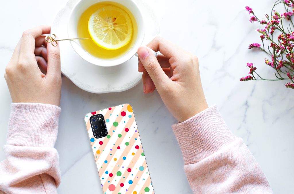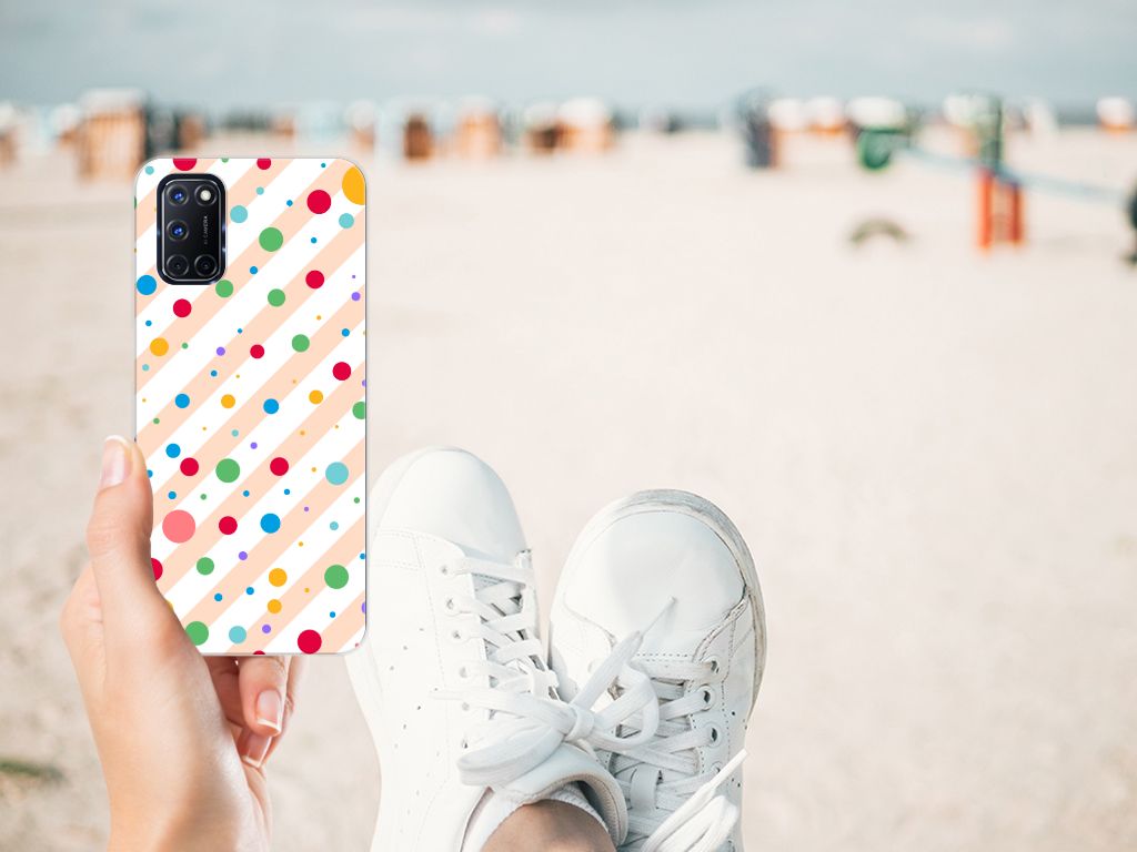Een OPPO A52 | A72 TPU bumper met verschillende kleuren stippen is een schitterende bescherming van jouw smartphone. De tpu case met het design Dots in alle kleuren van de regenboog komt voor jou als geroepen. Maak je geen gebruik van dit zeer mooie hoesje, dan kan het met jouw smartphone een beetje beroerd aflopen. Deze mooie tpu case met verschillende soorten klompen in verschillende kleuren is zo’n beetje de meest flexibele case die er bestaat. Het hoesje met stippen zorgt voor een goede bescherming van je smartphone, vooral aan de achterzijde en zijkanten. Met een tpu hoesje met stippen in verschillende kleuren blijft jouw gsm volledig in tact. Heb je liever een tpu case met stippen in andere opvallende kleuren? Ontwerp dan zelf een tpu case met je eigen foto’s en teksten! De case wordt aan de achterzijde bedrukt met klompen, de zijkanten blijven doorzichtig.