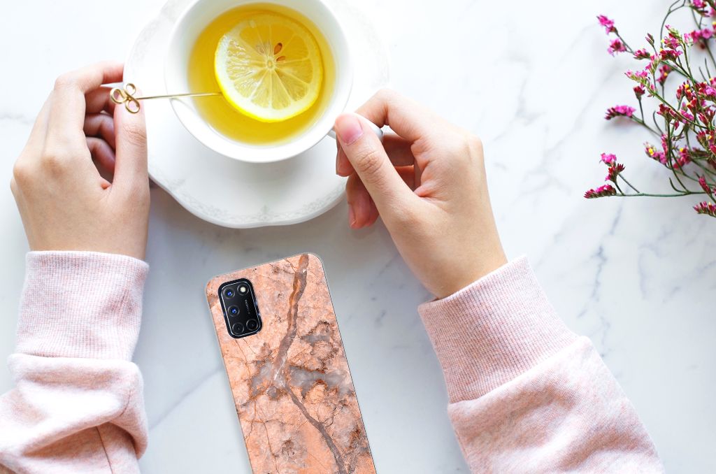 Dit design hoesje met Marmer Oranje is zeer geschikt voor jouw kostbare telefoon. Vanwege zijn prachtige lichtval en vastheid is marmer een zeer gewild bouwmateriaal. Wij kunnen inmiddels concluderen dat dit hoesje met oranje marmer ook zeer gewild is. Beloon jezelf en je telefoon met dit hele mooie OPPO A52 | A72 TPU Siliconen Hoesje. Naast het oranje marmer zijn er de diverse marmersoorten in een ruim kleurenpallet te krijgen. Deze tpu case met marmer in oranje wordt aan de achterzijde bedrukt. De case beschikt over opstaande randen en is gemaakt van onbreekbaar materiaal. De randen van de case in oranje marmer blijven transparant. Wij hebben onze designer veel vrijheid gegeven met het ontwerpen dit mooie hoesje. Het resultaat zie je terug in deze tpu case met oranje marmer, dat een hele goede bescherming is voor jouw smartphone. Des te mooi dat wij voor variatie hebben gekozen door een hoesje met oranje marmer aan de bieden.