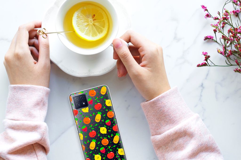 Een fris, fruitig en vrolijk hoesje, deze case met afbeeldingen van aardbeien, ananassen, appels, sinaasappels en citroenen. Minstens twee stuks fruit per dag wordt aanbevolen als dagelijkse hoeveelheid voor de mens. Dit verkleint de kans op allerlei ziekten. Dus met het aantal stukken fruit op de OPPO A53 5G | OPPO A73 5G Siliconen Case zou je wel een maandje zoet moeten zijn. Met het hoesje zelf kun je je hele leven doen, dit is namelijk niet stuk te krijgen. Dit komt door het sterke en flexibele materiaal waarvan het gemaakt is. De vrolijk stemmende case het desing Fruits maakt jouw telefoon dus zeer duurzaam. Zorg ervoor dat jouw smartphone gezond blijft en kies voor dit hoesje met frivool fruit. Een tpu case met fruit wordt alleen aan de bovenkant bedrukt en is zeer flexibel. De randen van het hoesje blijven transparant en worden niet bedrukt met het fruit.