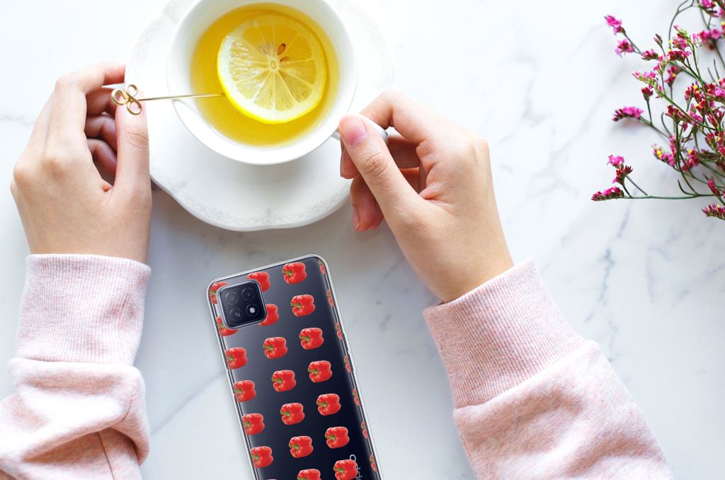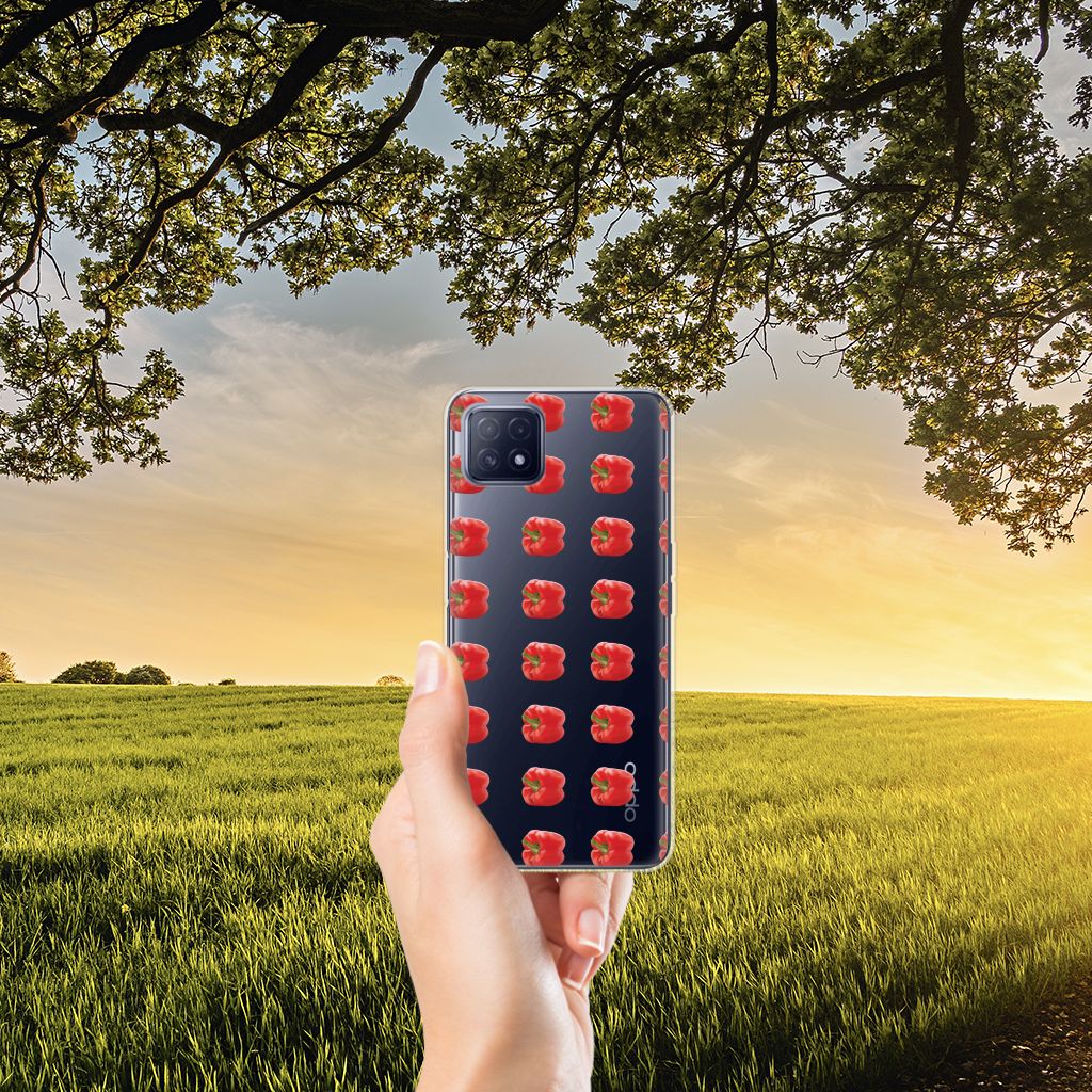 Er zit pit in jouw OPPO A53 5G | OPPO A73 5G Siliconen Case dankzij dit design met rode paprika’s. Paprika’s zijn er in allerlei kleuren en vormen en ze hebben gemeen dat ze heel erg gezond zijn. De rode paprika’s op deze case staan op een grijs met witte geblokte achtergrond en vormen een opvallende verschijning. Heb jij ooit iemand in je nabije omgeving rond zien lopen met een design hoesje met rode paprika’s? Waarschijnlijk niet. Dit hoesje wordt alleen aan de bovenkant bedrukt met paprika’s en is zeer flexibel. De randen van het hoesje blijven transparant en worden niet bedrukt. Met dit hoesje past jouw telefoon altijd in je broekzak. Zeker weten dat je met dit hoesje met rode paprika’s een smartphone accessoire te pakken hebt waarmee je jezelf in de schijnwerpers zet. Als je andere kleuren paprika’s op je hoesje wilt, raden we je aan ons assortiment design hoesjes te bekijken of zelf een hoesje te ontwerpen.