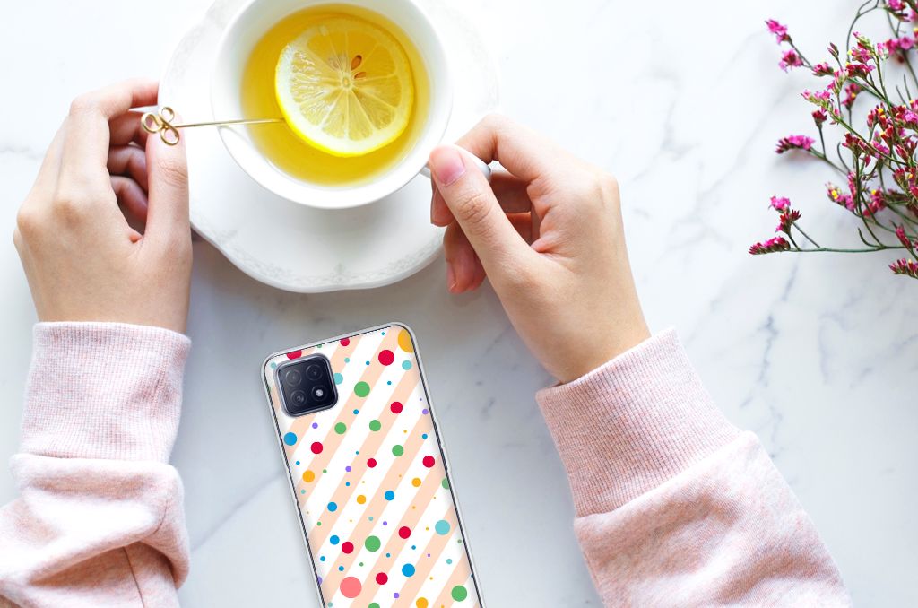 Een OPPO A53 5G | OPPO A73 5G TPU bumper met verschillende kleuren stippen is een schitterende bescherming van jouw smartphone. De tpu case met het design Dots in alle kleuren van de regenboog komt voor jou als geroepen. Maak je geen gebruik van dit zeer mooie hoesje, dan kan het met jouw smartphone een beetje beroerd aflopen. Deze mooie tpu case met verschillende soorten klompen in verschillende kleuren is zo’n beetje de meest flexibele case die er bestaat. Het hoesje met stippen zorgt voor een goede bescherming van je smartphone, vooral aan de achterzijde en zijkanten. Met een tpu hoesje met stippen in verschillende kleuren blijft jouw gsm volledig in tact. Heb je liever een tpu case met stippen in andere opvallende kleuren? Ontwerp dan zelf een tpu case met je eigen foto’s en teksten! De case wordt aan de achterzijde bedrukt met klompen, de zijkanten blijven doorzichtig.