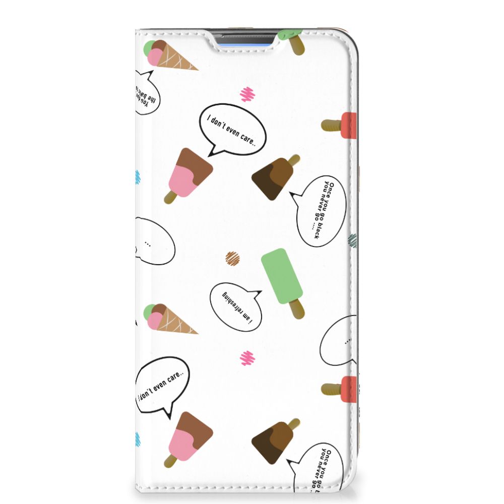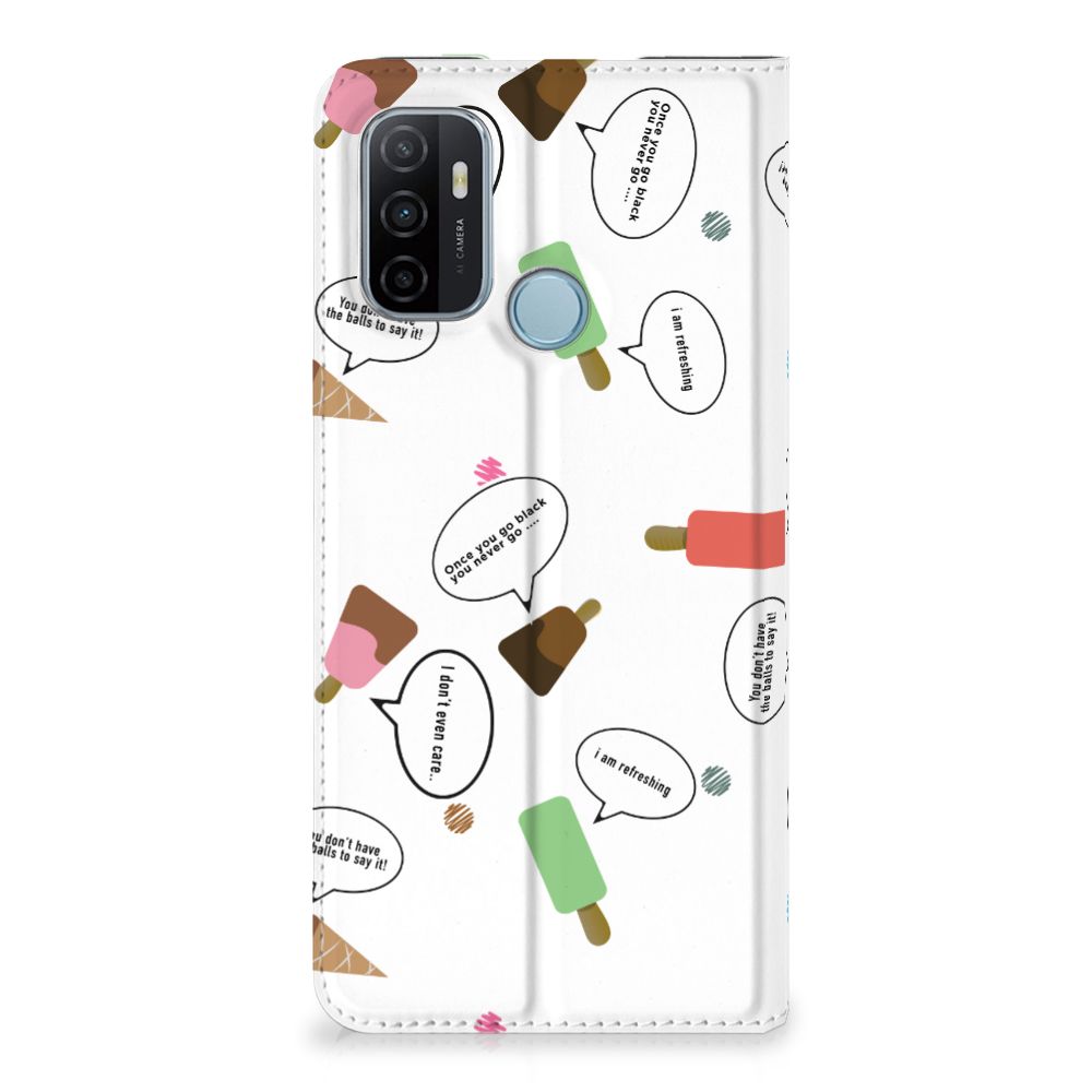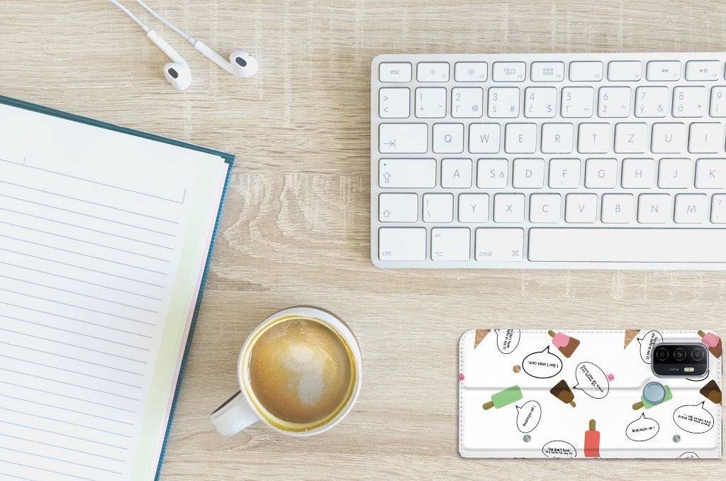 Van deze vrolijke OPPO A53 | A53s Flip Style Cover met daarop verschillende soorten ijsjes met tekstwolkjes krijg je sowieso een vrij en zomers gevoel. De zomer komt naar je toe met deze print van ijsjes met tekstwolkjes. Ben je op het strand, dan ontbreekt een lekker ijsje natuurlijk niet. Net zoals je je smartphone bij de hand hebt, met daaromheen een design hoesje met bijzondere ijsjes en tekstwolkjes. Jouw telefoon kan dan de bescherming in de vorm van een stand case met ijsjes zeer goed gebruiken. Alle zijden van dit hoesje worden bedrukt met ijsjes en dankzij de speciale standaard is het erg prettig om filmpjes te bekijken. De case wordt aan de binnenzijde met een magneet afgesloten en de houder aan de binnenzijde is van TPU. Onder alle weersomstandigheden zal deze case met 1 opbergvakje en ijsjes perfect functioneren, ook op het strand met een ijsje in je hand.