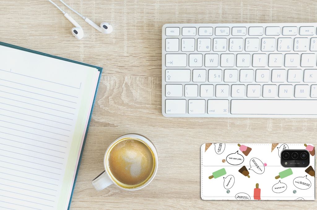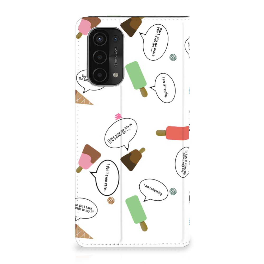 Van deze vrolijke OPPO A54 5G | A74 5G | A93 5G Flip Style Cover met daarop verschillende soorten ijsjes met tekstwolkjes krijg je sowieso een vrij en zomers gevoel. De zomer komt naar je toe met deze print van ijsjes met tekstwolkjes. Ben je op het strand, dan ontbreekt een lekker ijsje natuurlijk niet. Net zoals je je smartphone bij de hand hebt, met daaromheen een design hoesje met bijzondere ijsjes en tekstwolkjes. Jouw telefoon kan dan de bescherming in de vorm van een stand case met ijsjes zeer goed gebruiken. Alle zijden van dit hoesje worden bedrukt met ijsjes en dankzij de speciale standaard is het erg prettig om filmpjes te bekijken. De case wordt aan de binnenzijde met een magneet afgesloten en de houder aan de binnenzijde is van TPU. Onder alle weersomstandigheden zal deze case met 1 opbergvakje en ijsjes perfect functioneren, ook op het strand met een ijsje in je hand.