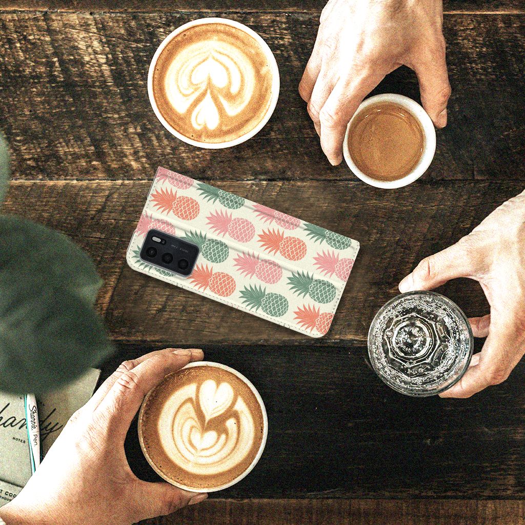 Ananas is een woord uit het Tupi, de taal van de Tupi-indianen, en betekent uitmuntende vrucht. Dit fruit van zeer hoge kwaliteit staat op onze superieure boekhoesjes, stand cases, hard cases en TPU cases. Jij blijft er gezond uitzien als je zo nu en dan een hap neemt van een Ananas , jouw smartphone blijft tip top in orde als je er een leuk telefoonhoesje omheen doet. Een ananas heeft stevig, veerkrachtig vruchtvlees. Een beetje te vergelijken met het TPU in onze hoesjes. TPU is elastisch materiaal, dat zeer buigzaam is. Vandaar dat het zeer schokbestendig is. Het ananas design staat op een stand case. Deze OPPO A54s | A16 | A16s Flip Style Cover beschermt jouw telefoon aan alle kanten en beschikt over een 1 opbergvakje en een speciale standaard. Het hoesje wordt afgesloten met een magneet aan de binnenzijde. De houder aan de binnenzijde is van TPU.