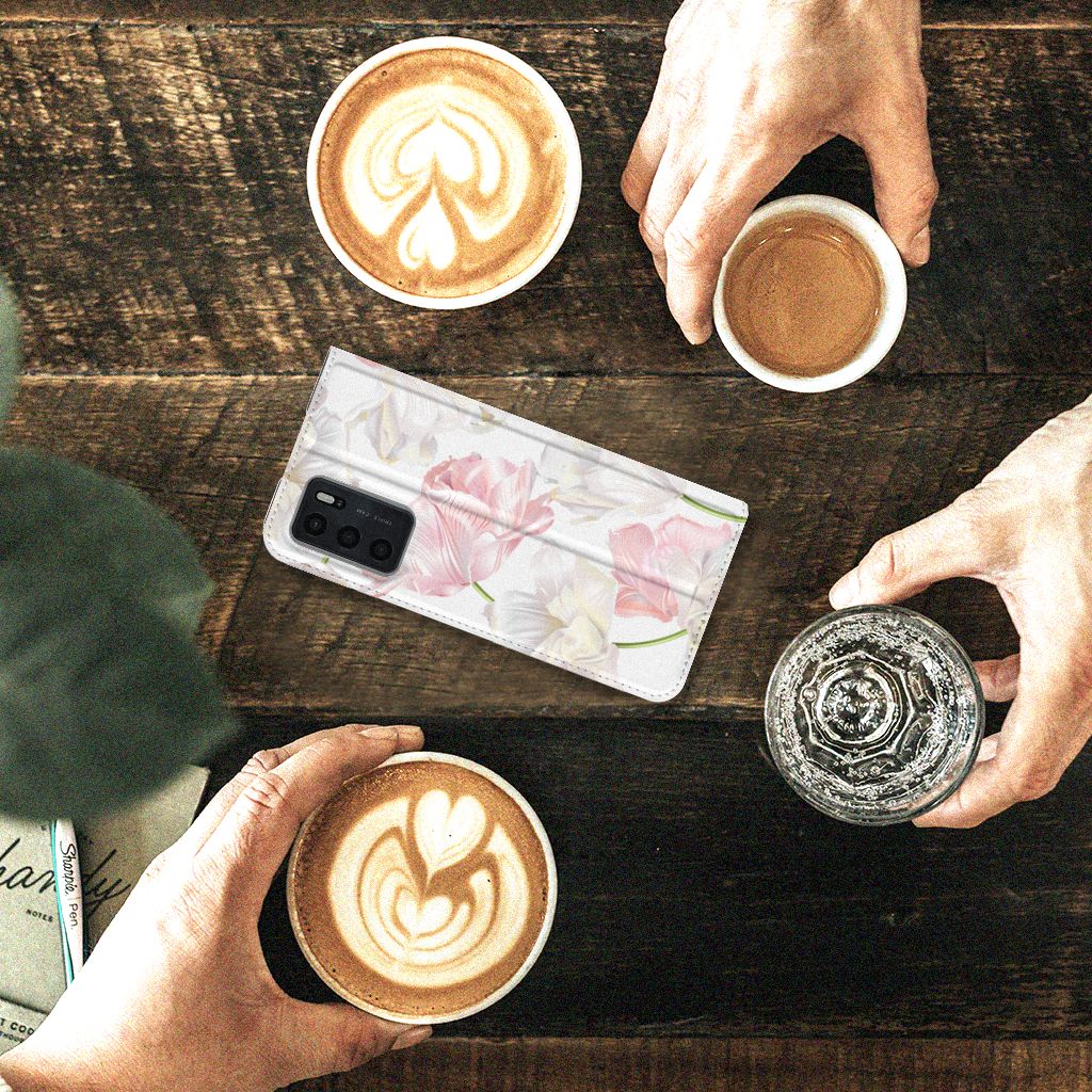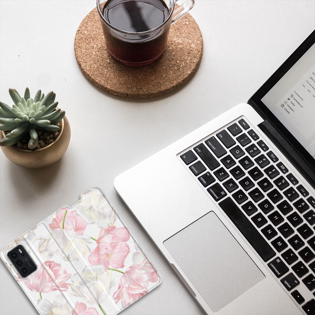 Een bosje bloemen doet een mens (en zijn smartphone) goed. De witte en roze bloemen op dit OPPO A54s | A16 | A16s Smart Cover geven jouw smartphone een zeer mooie uitstraling. Je wordt er ook meteen een stuk rustiger van als je aan het appen of aan het bellen bent. Valt dan je telefoon op de grond, dan zal er dankzij de stand case met het design Lovely Flowers ontstaan. Onze stand cases met roze en witte bloemen zien er zeer prettig uit en zijn heel praktisch, wat blijkt uit onder meer het vakje aan de binnenkant en de handige standaard waarmee je de smartphone rechtop op tafel neer kunt zetten. De roze en witte bloemen passen goed op alle zijden van de case. Op deze stand case van leer en TPU (houder aan de binnenkant) kun je trouwens ook je eigen bloemige ontwerp zetten. In een paar simpele stappen maak je zelf een stand hoesje met daarop jouw mooiste bloemen.