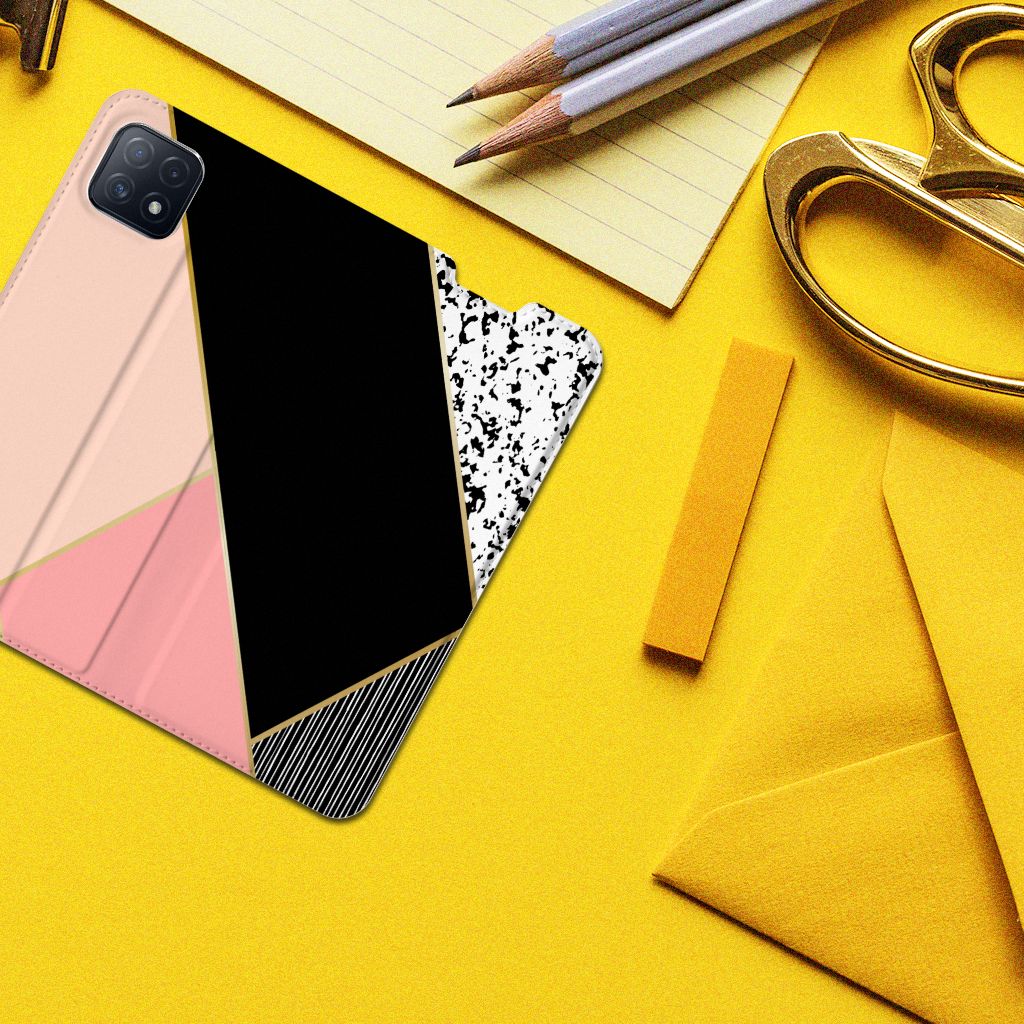 OPPO A73 5G Print Stand Case Zwart Roze Vormen