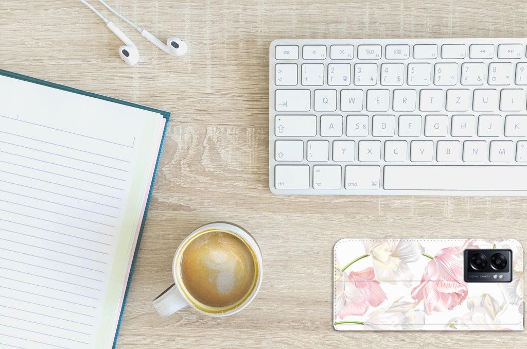 Een bosje bloemen doet een mens (en zijn smartphone) goed. De witte en roze bloemen op dit OPPO A77 5G | A57 5G Smart Cover geven jouw smartphone een zeer mooie uitstraling. Je wordt er ook meteen een stuk rustiger van als je aan het appen of aan het bellen bent. Valt dan je telefoon op de grond, dan zal er dankzij de stand case met het design Lovely Flowers ontstaan. Onze stand cases met roze en witte bloemen zien er zeer prettig uit en zijn heel praktisch, wat blijkt uit onder meer het vakje aan de binnenkant en de handige standaard waarmee je de smartphone rechtop op tafel neer kunt zetten. De roze en witte bloemen passen goed op alle zijden van de case. Op deze stand case van leer en TPU (houder aan de binnenkant) kun je trouwens ook je eigen bloemige ontwerp zetten. In een paar simpele stappen maak je zelf een stand hoesje met daarop jouw mooiste bloemen.