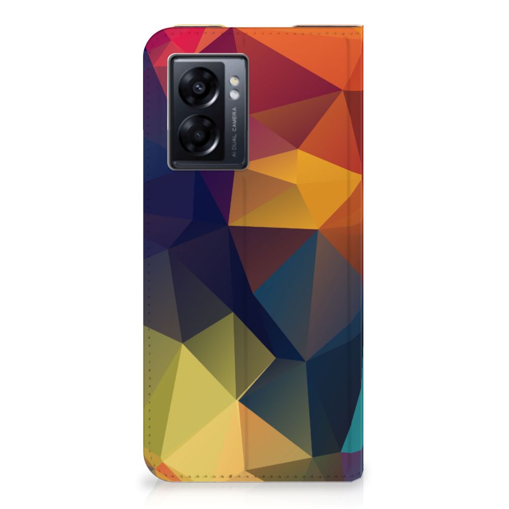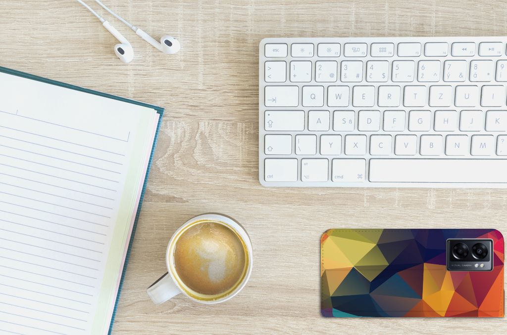 Veelkleurige driehoeken die samen eindeloze asymmetrische patronen lijken te vormen. Het is het abstracte schouwspel dat op dit fraaie hoesje voor je OPPO A77 5G | A57 5G direct de aandacht trekt noemen we voor het gemak trekt noemen we voor het gemak Polygon Color. De een ziet er een berglandschap in, de ander piramides. Wat zie jij erin? Zeker is in elk geval dat de aanblik van dit fascinerende ontwerp je niet snel gaat vervelen. Het kleurige spel van lijnen en vlakken blijft eindeloos boeien en geeft jouw Stand Case een hippe en kunstzinnige uitstraling. De kracht die het lijnenspel uitstraalt, komt ook terug in het hoesje zelf. De solide hoes van PU-leer beschikt ook over een 1 pashouder en een speciale standaard. Het hoesje wordt afgesloten met een magneet aan de binnenzijde. De houder aan de binnenzijde is van TPU. Alle zijden worden bedrukt.
