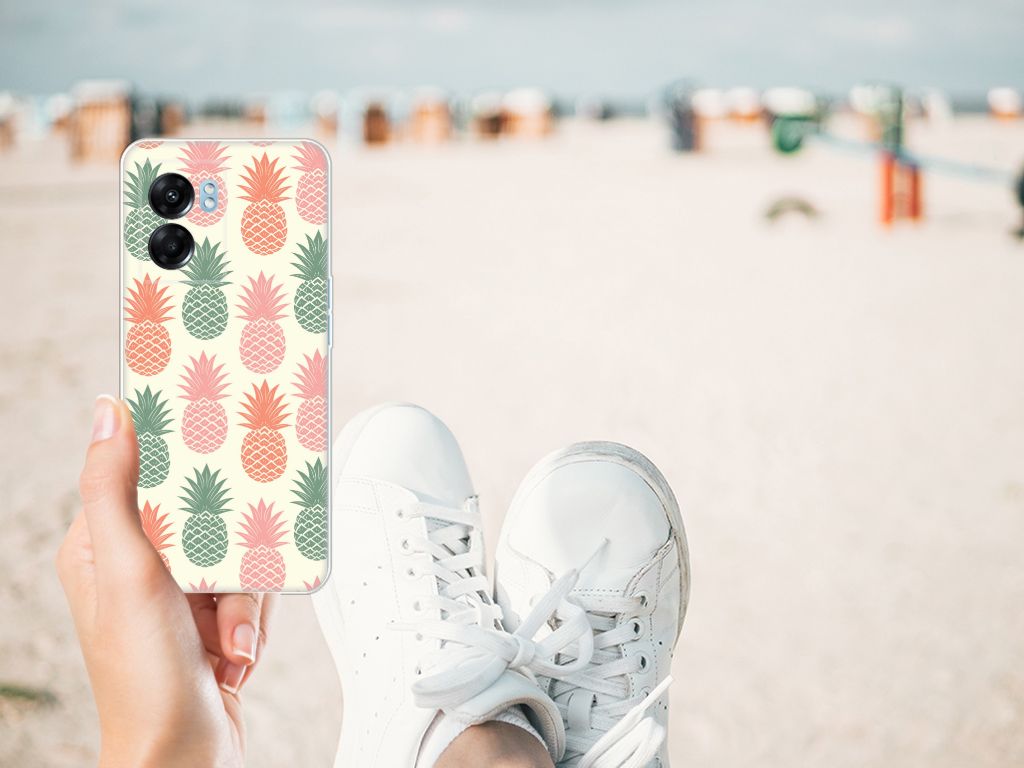 Ananas is een woord uit het Tupi, de taal van de Tupi-indianen, en betekent uitmuntende vrucht. Dit fruit van zeer hoge kwaliteit staat op onze superieure boekhoesjes, stand cases, hard cases en TPU cases. Jij blijft er gezond uitzien als je zo nu en dan een hap neemt van een Ananas , jouw smartphone blijft tip top in orde als je er een leuk telefoonhoesje omheen doet. Een ananas heeft stevig, veerkrachtig vruchtvlees. Een beetje te vergelijken met het TPU in onze hoesjes. TPU is elastisch materiaal, dat zeer buigzaam is. Vandaar dat het zeer schokbestendig is. Het ananas design staat op een staat op een TPU case. Deze OPPO A77 | A57 5G Siliconen Case wordt alleen aan de bovenkant bedrukt en is zeer flexibel. De randen van het hoesje blijven transparant.