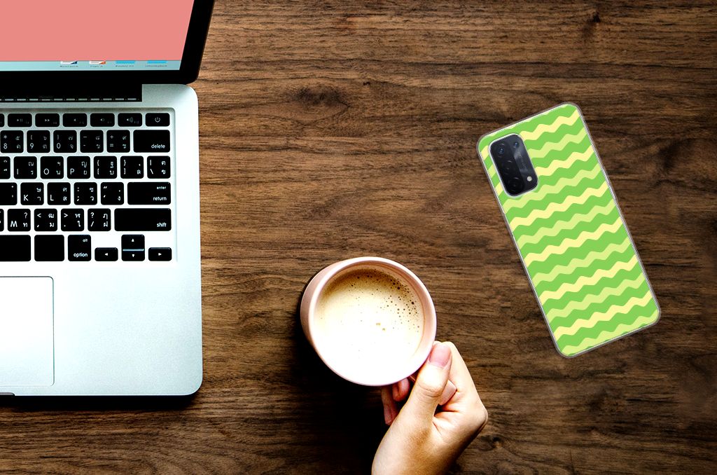 Dit groene design hoesje met groene golven is speciaal ontworpen voor jouw telefoon. We hebben een vleugje geel toegevoegd, zodat er sprake is van variatie. Dit Waves Green hoesje ziet er flitsend uit. Dat kan ook niet anders, als je weet dat we veel energie steken in het bedenken van originele designs. Een heel strak OPPO A93 5G TPU bumper, met zeer veel opties. Past dit groene design hoesje met golven goed bij jou? Bestel het dan vandaag nog, tegen zeer lage kosten. Het design staat op een TPU case. Dit hoesje wordt alleen aan de bovenkant bedrukt en is zeer flexibel. De randen van het hoesje met groene golven blijven transparant en worden niet bedrukt. Met dit hoesje past jouw telefoon altijd in je broekzak.
