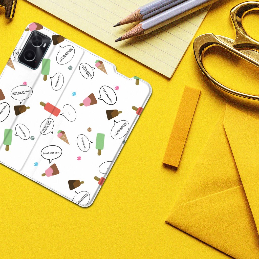 Van deze vrolijke OPPO A96 | A76 Flip Style Cover met daarop verschillende soorten ijsjes met tekstwolkjes krijg je sowieso een vrij en zomers gevoel. De zomer komt naar je toe met deze print van ijsjes met tekstwolkjes. Ben je op het strand, dan ontbreekt een lekker ijsje natuurlijk niet. Net zoals je je smartphone bij de hand hebt, met daaromheen een design hoesje met bijzondere ijsjes en tekstwolkjes. Jouw telefoon kan dan de bescherming in de vorm van een stand case met ijsjes zeer goed gebruiken. Alle zijden van dit hoesje worden bedrukt met ijsjes en dankzij de speciale standaard is het erg prettig om filmpjes te bekijken. De case wordt aan de binnenzijde met een magneet afgesloten en de houder aan de binnenzijde is van TPU. Onder alle weersomstandigheden zal deze case met 1 opbergvakje en ijsjes perfect functioneren, ook op het strand met een ijsje in je hand.