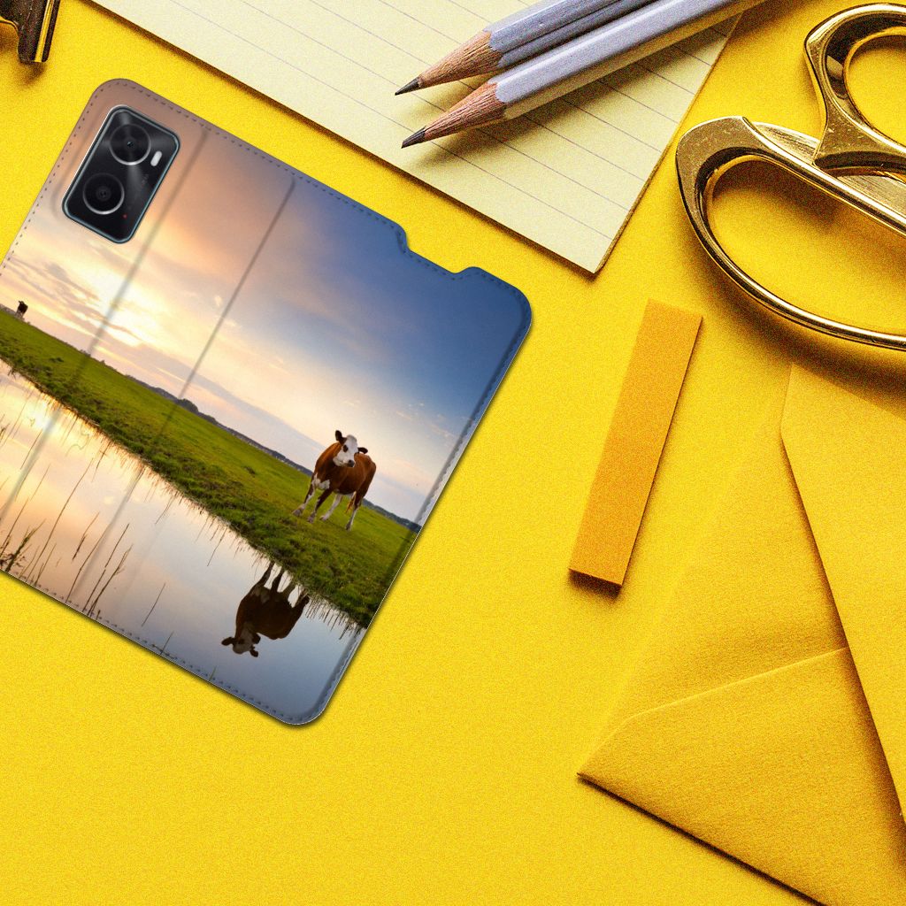 Het levert een idyllisch plaatje op, dit hoesje met een koe en ondergaande zon op de achtergrond. Door een koe buiten te laten lopen en grazen, hebben ze minder kans om ziek te worden. De Koe graast het liefst met soortgenoten, al zijn deze een stukje van de koe op de case verwijderd. Dit levert ook een mooi plaatje op, zoals je kunt zien op dit design hoesje. Deze stand case ziet er strak uit en is voorzien van verschillende uitsparingen. Een OPPO A96 | A76 Hoesje maken met magneet aan de binnenzijde beschermt jouw smartphone overal. Alle zijden zijn bedrukt. Koeien hebben lange graasperioden nodig, afgewisseld door rust- en herkauwperioden. Zo goed als grazen voelt voor koeien, zo lang zal jouw design hoesje meegaan. De binnenkant van de stand case is van TPU, de buitenzijde van leer.
