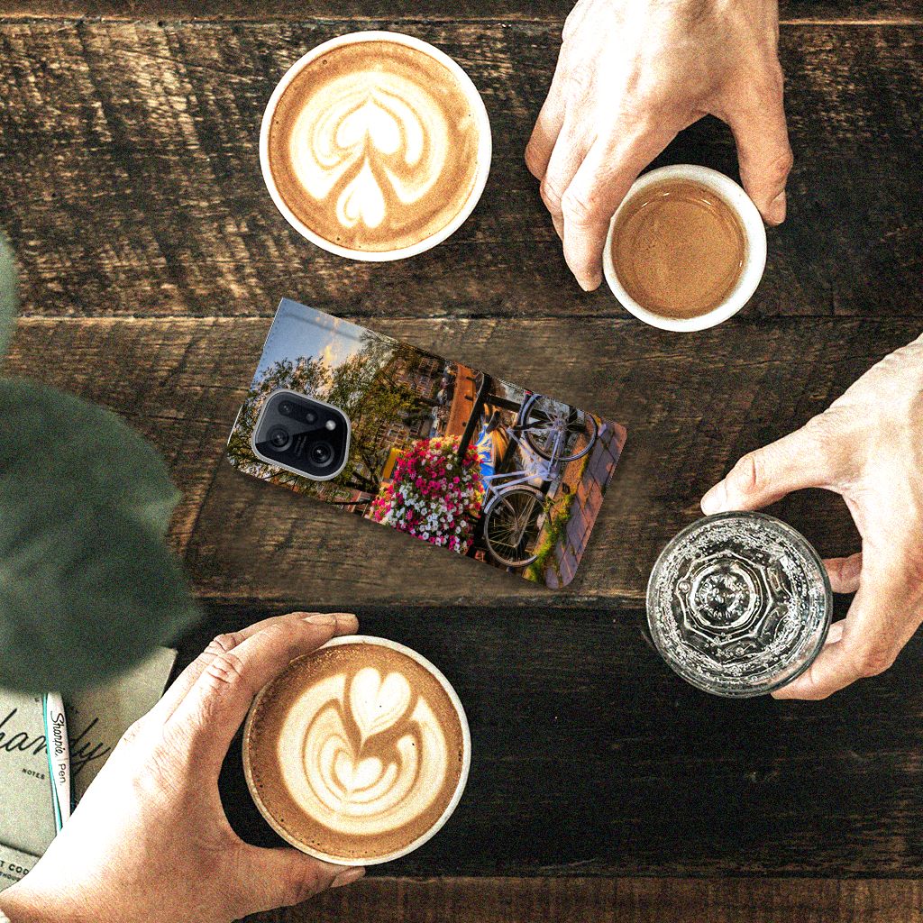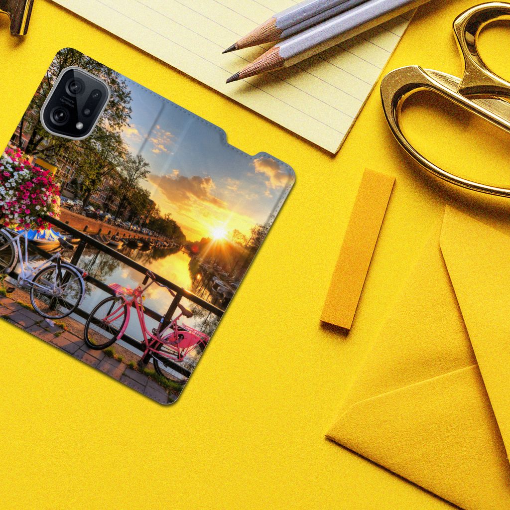 Amsterdam is meer dan ooit een toeristische trekpleister. Een bezoek aan de hoofdstad is niet compleet als er geen bezoek is gebracht aan de Amsterdamse Grachten. Ze zijn een symbool van de stad en hebben een enorme culturele en historische waarde. Daarom kunnen ze natuurlijk niet ontbreken in onze collectie design hoesjes. Dit schitterende design hoesje met Amsterdamse grachten tref je enkel en alleen aan bij B2C Telecom. De ondergaande zon en de fleurige en fraaie bloempakketten zorgen voor een prachtig totaalplaatje. Amsterdam is wereldberoemd om haar prachtige grachten uit de zeventiende eeuw. Dit smartphone hoesje is hier een eerbetoon aan. Het design staat op een stand case. Deze OPPO Find X5 Book Cover beschermt jouw telefoon aan alle kanten en beschikt over een 1 opbergvakje en een speciale standaard. Het hoesje wordt afgesloten met een magneet aan de binnenzijde. De houder aan de binnenzijde is van TPU. Alle zijden van de stand case worden bedrukt.