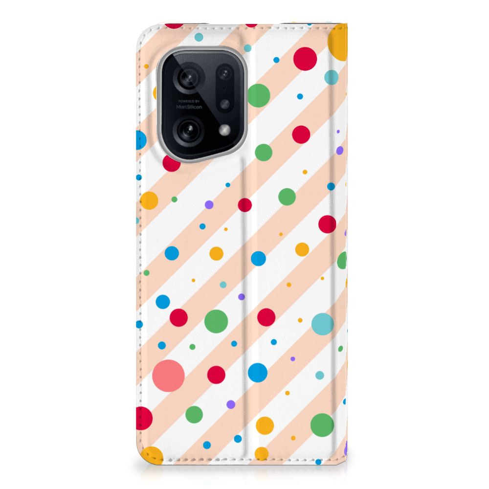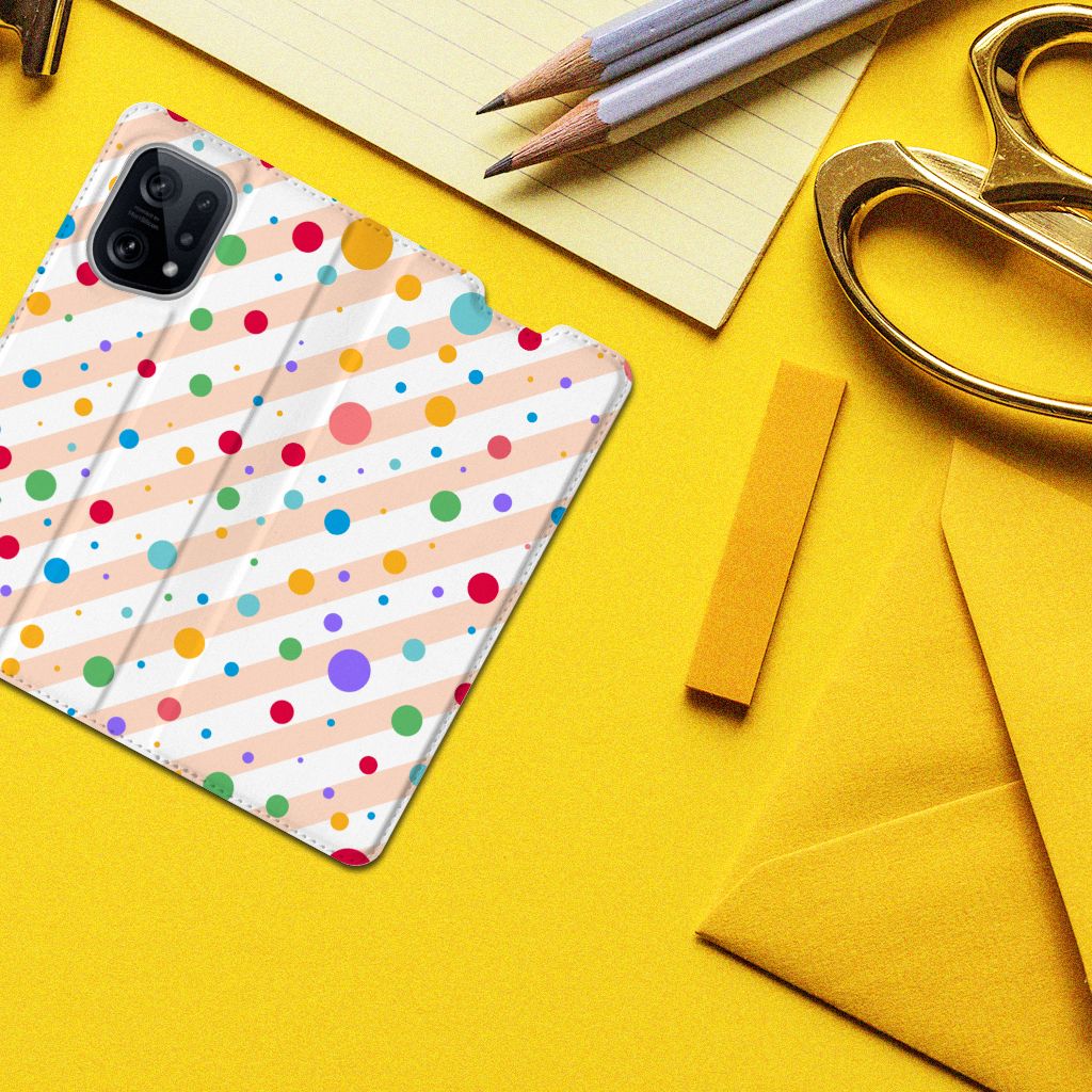 Een OPPO Find X5 Hoesje met Magneet met verschillende kleuren stippen is een schitterende bescherming van jouw smartphone. De stand case met het design Dots in alle kleuren van de regenboog komt voor jou als geroepen. Maak je geen gebruik van dit zeer mooie hoesje, dan kan het met jouw smartphone een beetje beroerd aflopen. Dit mooie stand hoesje met verschillende kleuren stippen zorgt voor een volledige bescherming van je smartphone en wordt aan alle zijden bedrukt. Dankzij de speciale standaard kun je rustig achteroverleunend filmpjes bekijken terwijl je je handen vrij hebt. Verder is de houder aan de binnenzijde van TPU. Jouw telefoon is dus zeer goed opgeborgen en kan geen kant op. Met een hoesje met stippen in verschillende kleuren op alle zijden blijft jouw telefoon volledig in tact. Heb je liever een stand case met stippen in andere opvallende kleuren? Ontwerp dan zelf case met je eigen foto’s en teksten!