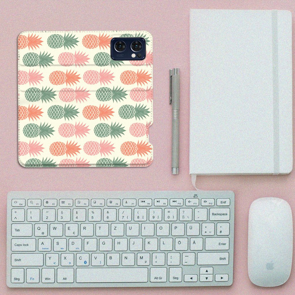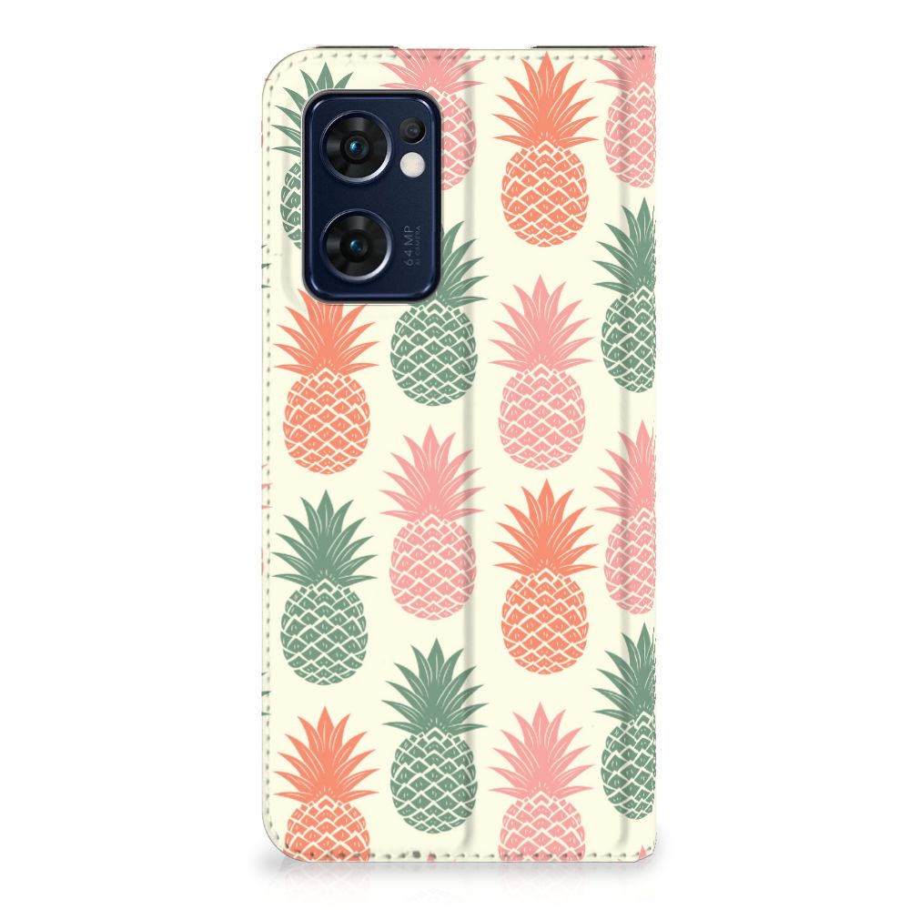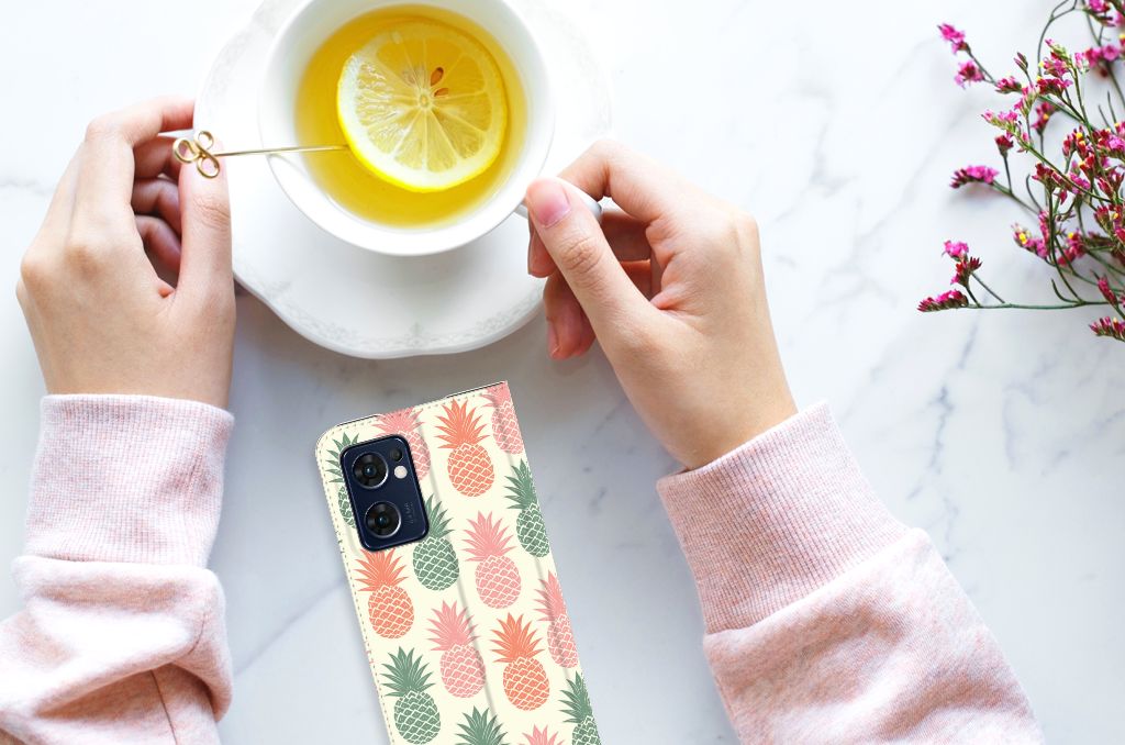 Ananas is een woord uit het Tupi, de taal van de Tupi-indianen, en betekent uitmuntende vrucht. Dit fruit van zeer hoge kwaliteit staat op onze superieure boekhoesjes, stand cases, hard cases en TPU cases. Jij blijft er gezond uitzien als je zo nu en dan een hap neemt van een Ananas , jouw smartphone blijft tip top in orde als je er een leuk telefoonhoesje omheen doet. Een ananas heeft stevig, veerkrachtig vruchtvlees. Een beetje te vergelijken met het TPU in onze hoesjes. TPU is elastisch materiaal, dat zeer buigzaam is. Vandaar dat het zeer schokbestendig is. Het ananas design staat op een stand case. Deze OPPO Find X5 Lite | Reno7 5G Flip Style Cover beschermt jouw telefoon aan alle kanten en beschikt over een 1 opbergvakje en een speciale standaard. Het hoesje wordt afgesloten met een magneet aan de binnenzijde. De houder aan de binnenzijde is van TPU.
