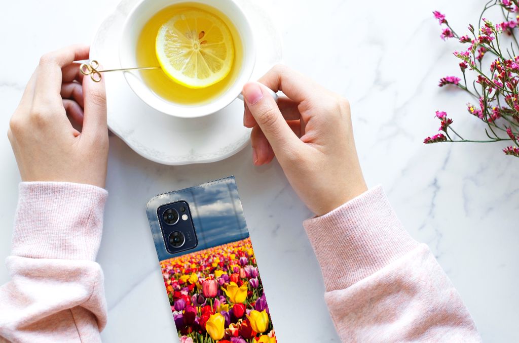 De tulp is een oer-Nederlandse bloem en heeft een lange geschiedenis. Deze OPPO Find X5 Lite | Reno7 5G Smart Cover met Tulpen ziet er bijzonder kleurrijk uit. Dit fleurige smartphone hoesje geeft een bijzondere bescherming van jouw apparaat. Tulpen zijn ideaal voor een kleurrijk begin van het tuinseizoen. Iedereen wordt er vrolijk van om te zien hoe deze bloemen het voorjaar kleur geven en het begin van de warmere tijd van het jaar aankondigen. Dan kan het toch niet anders of jij wordt heel erg blij van deze stand case met tulpen? Deze populaire stand case heeft ruimte voor een pasje of briefgeld aan de binnenzijde en wordt magnetisch afgesloten. De houder aan de binnenkant is van TPU en de case wordt aan alle zijden bedrukt met tulpen. Je kunt ook zelf een stand case maken met daarop jouw favoriete bloemen.