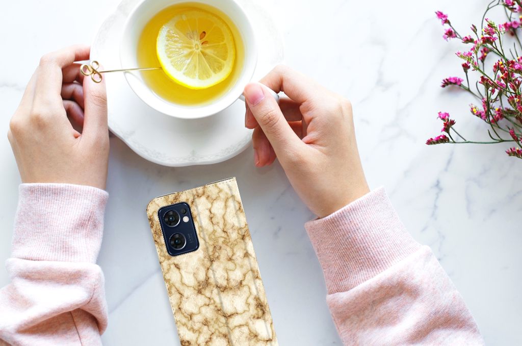 Deze OPPO Find X5 Lite | Reno7 5G Standcase met Marmer Goud is het waard om een blokje voor om te rijden. Dit is overigens niet nodig. Als je het hoesje met goud marmer nu bestelt heb je het zeer snel in huis. Je kunt er bij wijze van spreken thuis op gaan zitten wachten. Je hebt diverse soorten marmer. We hebben enkele fraaie kleuren op onze hoesjes gezet, zoals in dit geval het gouden marmer. Het gouden marmer wordt bedrukt op alle zijden van de stand case, die beschikt over een vakje voor pasjes of briefgeld en een magnetische sluiting aan de binnenzijde. Verder heeft de case met goud marmer een houder van TPU. De rijkheid aan kleuren en variaties in afwerking is een schitterende eigenschap van marmer. Dit stand hoesje met goud marmer heeft ook veel schitterende eigenschappen en is de ideale bescherming voor jouw smartphone.
