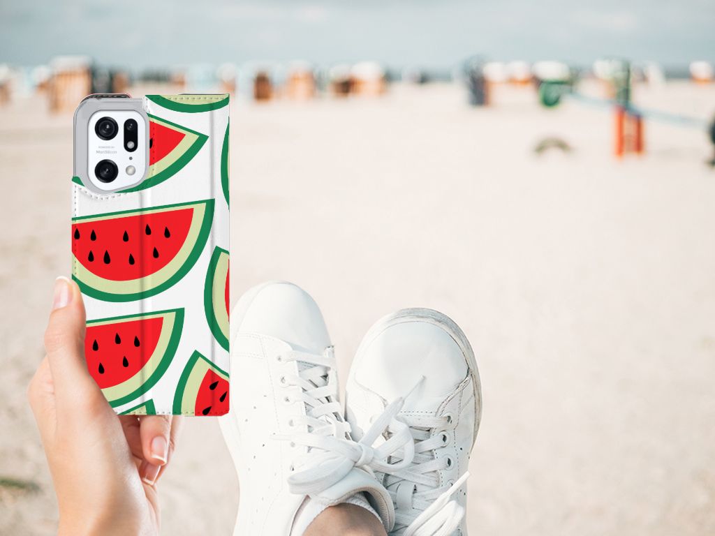 Watermeloenen zijn uitstekende dorstlessers, misschien dat je daarom juist in de zomermaanden extra enthousiast raakt van dit design hoesje Watermelons. Jij blijft gezond als je zo nu en dan een watermeloen neemt, jouw smartphone blijft in tact als je er deze OPPO Find X5 Pro Flip Style Cover omheen doet. De stand case beschermt jouw telefoon aan alle kanten en beschikt over een 1 opbergvakje en een speciale standaard. Het hoesje wordt afgesloten met een magneet aan de binnenzijde. De houder aan de binnenzijde is van TPU. Je kunt ook kiezen voor andere soorten fruit op je hoesje. Kijk maar eens naar onze andere design hoesjes op onze website.