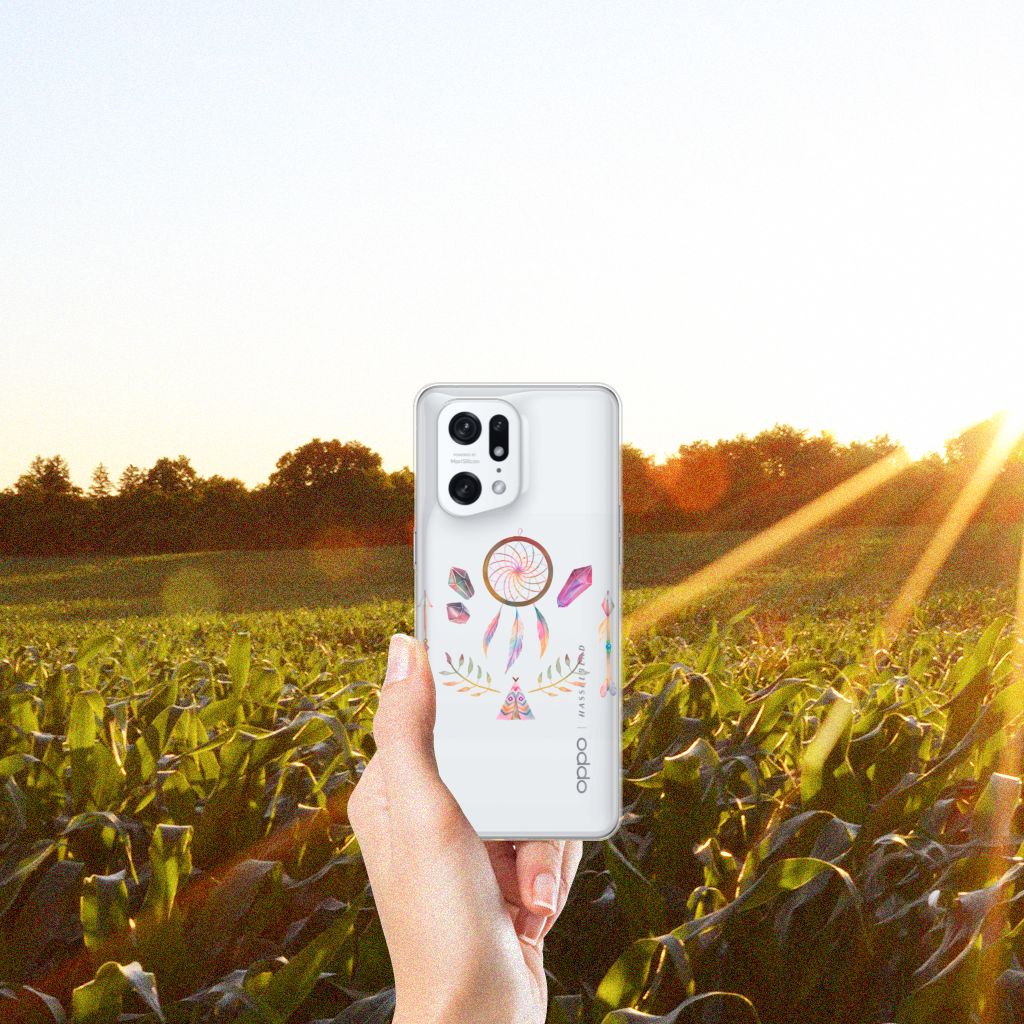 Een dromenvanger werd lang geleden al door een indianenvolk in Noord-Amerika gebruikt om nare dromen te weren. Nu nog hangen mensen over de hele wereld dromenvangers boven hun bed. Maar ook op een telefoonhoesje staat zo’n boho dreamcatcher heel mooi. Dit mooie design dat bestaat uit een tipi, pijlen en dromenvanger heeft veel verschillende prachtige kleuren. Maar omdat het ontwerp minimalistisch en klein is, is het design toch subtiel te noemen. Dit ontwerp staat op een Telefoonhoesje met Naam voor je OPPO Find X5 Pro. TPU is flexibel en heel erg sterk. Zo is je telefoon aan de achterkant en de randen heel goed beschermd. De case is aan de bovenkant bedrukt, de randen blijven transparant. Het TPU-hoesje is perfect te combineren met een screenprotector, zo zijn je telefoon en je beeldscherm altijd goed beschermd.