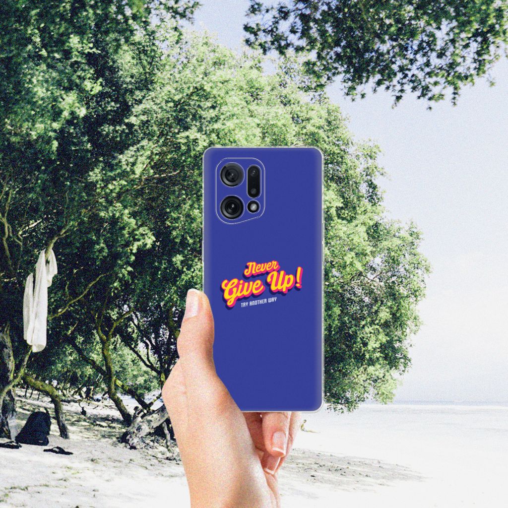 Ben je op zoek naar een uniek telefoonhoesje voor je OPPO Find X5? Dan ben je bij B2C Telecom aan het juiste adres! Speciaal voor jou hebben we dit prachtige Never Give Up design in onze collectie hoesjes opgenomen. Het design wordt bedrukt op een Siliconen hoesje met naam en is gemaakt van flexibel rubber. Het design wordt alleen aan de bovenkant van het hoesje bedrukt en de randen blijven transparant. Aan de zijkanten zijn uitsparingen gemaakt waardoor je met gemak alle knoppen en poorten kunt bedienen. Wij adviseren om dit hoesje in combinatie met een screenprotector te gebruiken voor een langere levensduur van je telefoon. Wil je dit design hoesje nog iets extra's geven? Voeg dan gratis je naam of een quote toe! Is dit design hoesje toch niet helemaal wat je zocht? Ontwerp dan zelf een hoesje in ons ontwerpprogramma.