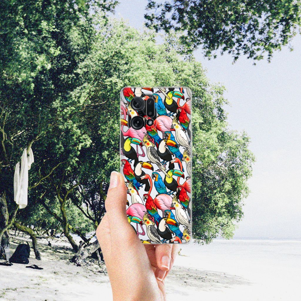 Dit exotische hoesje vol prachtige vogels is een genot voor het oog. Dankzij de felgekleurde toekans, papegaaien, flamingo’s en kaketoes op dit design word je meteen vrolijk als je naar dit hoesje kijkt. Je waant je meteen in de tropen met dit bonte gezelschap tegen een witte achtergrond. Het ontwerp staat op een TPU Hoesje voor de OPPO Find X5. TPU is een flexibel en onbreekbaar materiaal. Zo is je telefoon aan de achterkant en de randen heel goed beschermd. De case met het birds-design is aan de bovenkant bedrukt, de randen blijven transparant. Het TPU-hoesje is perfect te combineren met een screenprotector. Zo zijn je telefoon en je beeldscherm optimaal beschermd.
