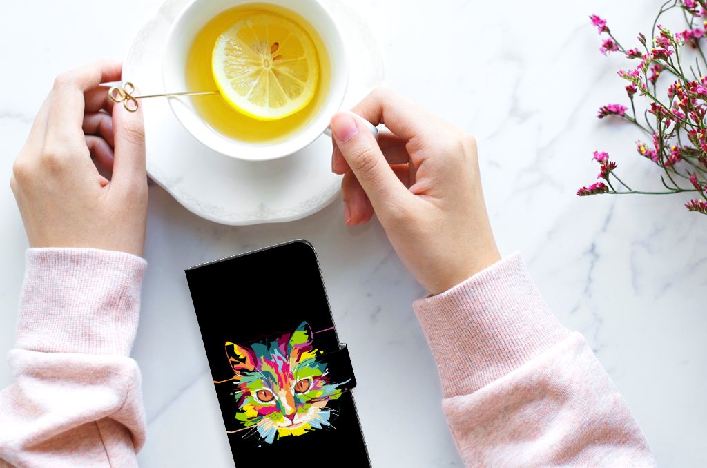 Als jij van katten houdt en op zoek bent naar een uniek hoesje, dan is dit het hoesje wat je wilt hebben. Op de voorkant van dit Leuk Hoesje vind je namelijk een mooie afbeelding van een kat in alle kleuren van de regenboog op een zwarte klassieke achtergrond. Naast dat het een mooi hoesje betreft, is het ook nog eens ontzettend handig. Zo kun je in deze bookcase wel twee á drie pasjes en briefgeld kwijt. Hiermee kun je jouw belangrijkste bezittingen op een plek bewaren in het boekhoesje en kun je jouw portemonnee voortaan thuislaten. Een bookcase heeft daarnaast ook nog het voordeel dat jouw telefoon aan alle zijdes wordt beschermd in dit leuke hoesje, dubbel zo handig dus!