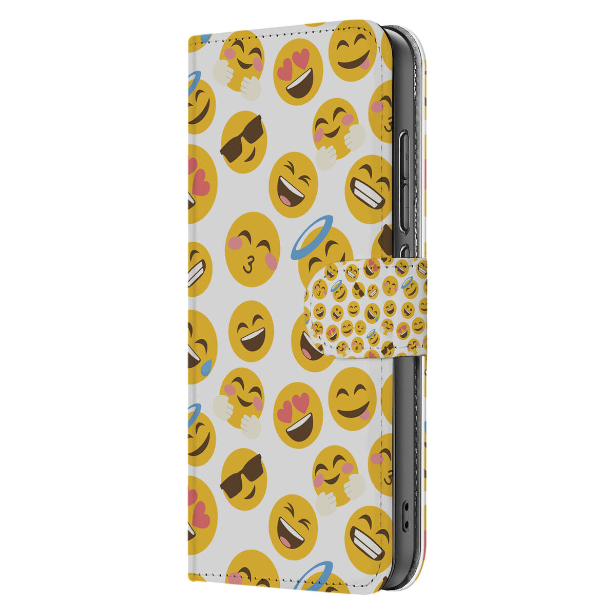 Een lichtgekleurde bookcase met overal gele emojis; het camera-eiland en de randen sluiten netjes aan op het patroon. Binnenin zie je drie kaartsleuven en een vak, uitgevoerd in donkergrijs. De magnetische tab is eveneens met het emoji-patroon bekleed voor een uniforme look.