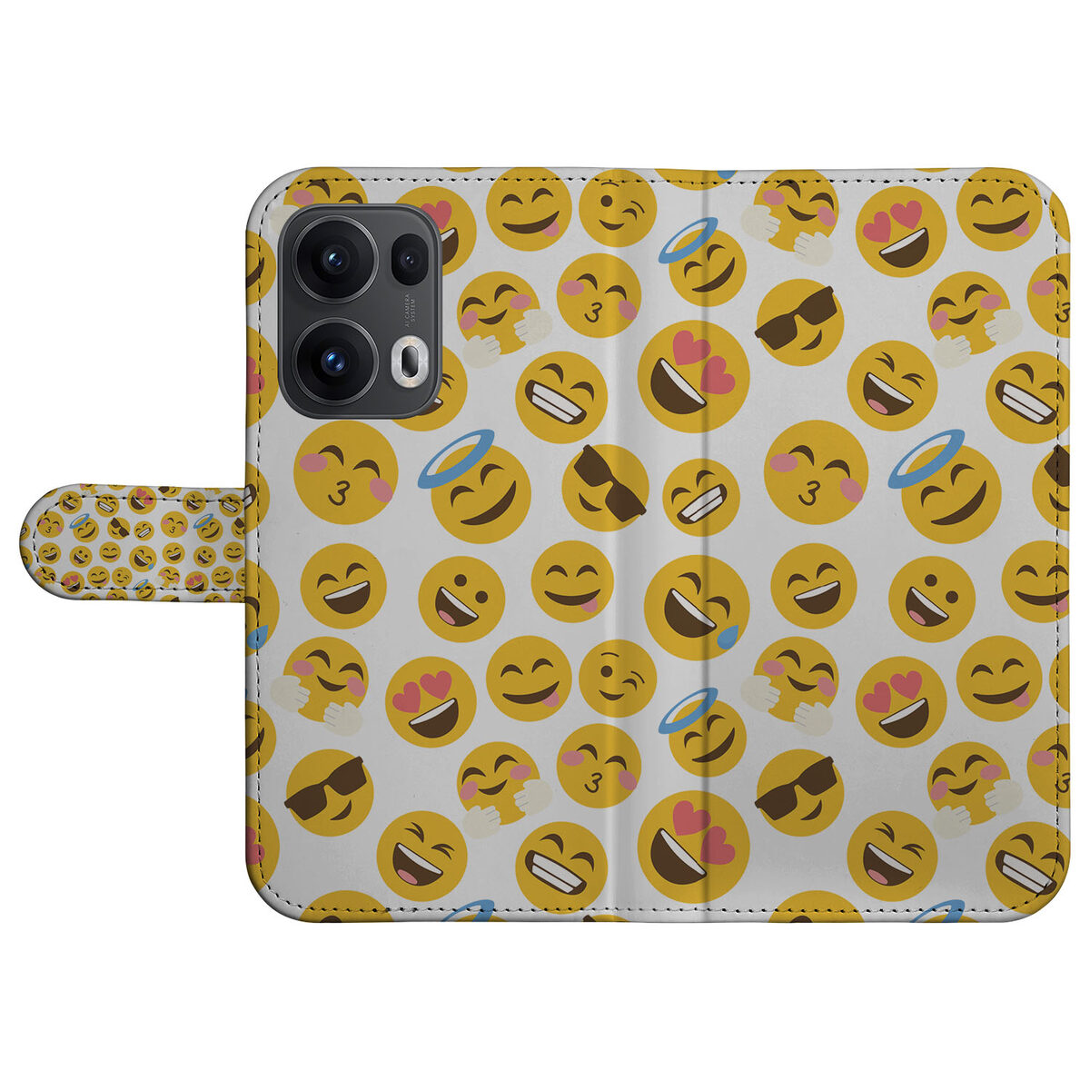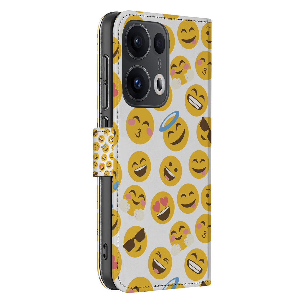 Breng meteen een glimlach op je gezicht met Emoji – het telefoonhoesje voor de OPPO Reno 13 Pro met een all-over patroon van gele smileys in verschillende uitdrukkingen (o.a. lachen, knipogen en hartjesogen). De lichte, bijna witte achtergrond laat de emojis knallen; ook de flap en de achterzijde zijn volledig meegeprint voor een full wrap effect. Van binnen zie je een strakke grijze afwerking met pasjesvakken: fun aan de buitenkant, praktisch aan de binnenkant.