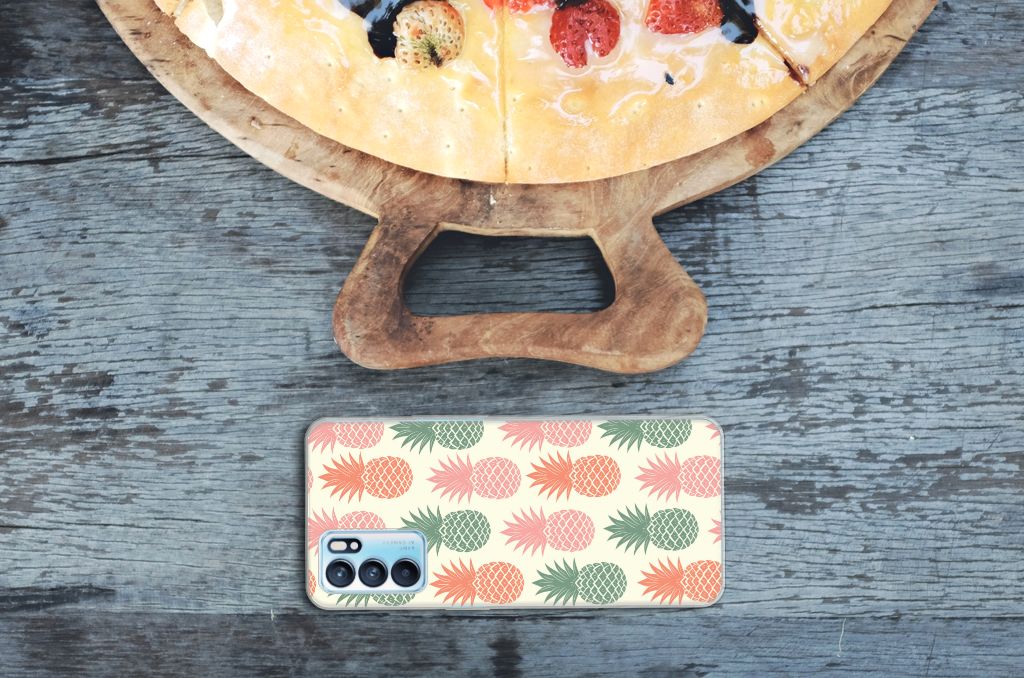 Ananas is een woord uit het Tupi, de taal van de Tupi-indianen, en betekent uitmuntende vrucht. Dit fruit van zeer hoge kwaliteit staat op onze superieure boekhoesjes, stand cases, hard cases en TPU cases. Jij blijft er gezond uitzien als je zo nu en dan een hap neemt van een Ananas , jouw smartphone blijft tip top in orde als je er een leuk telefoonhoesje omheen doet. Een ananas heeft stevig, veerkrachtig vruchtvlees. Een beetje te vergelijken met het TPU in onze hoesjes. TPU is elastisch materiaal, dat zeer buigzaam is. Vandaar dat het zeer schokbestendig is. Het ananas design staat op een staat op een TPU case. Deze OPPO Reno 6 5G Siliconen Case wordt alleen aan de bovenkant bedrukt en is zeer flexibel. De randen van het hoesje blijven transparant.