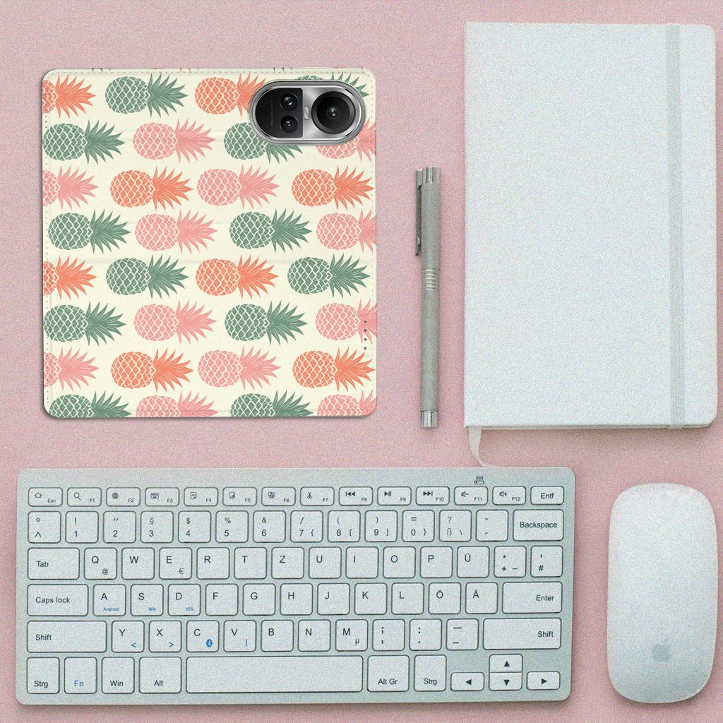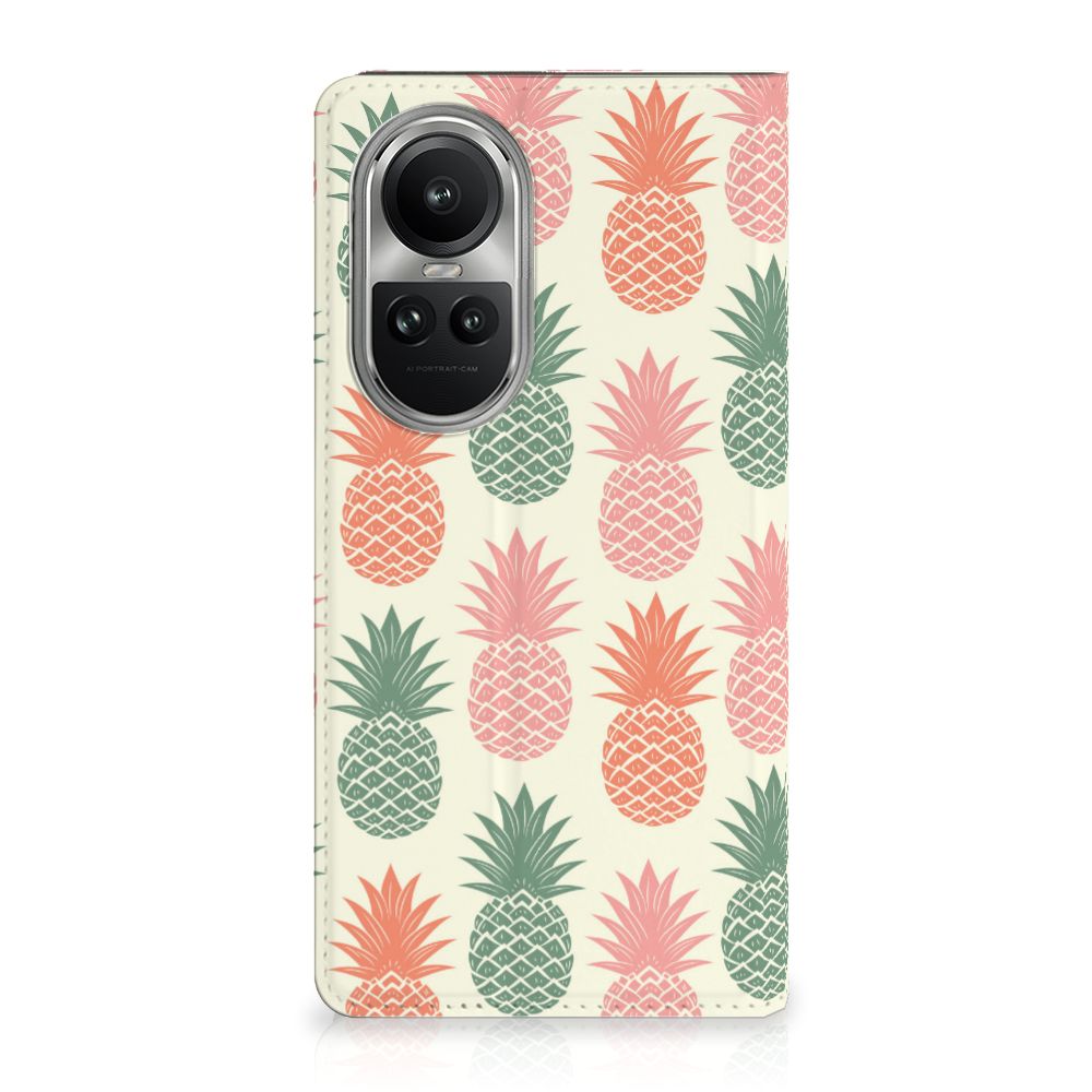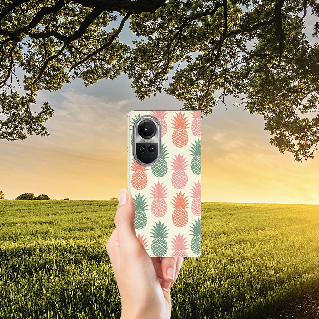 Ananas is een woord uit het Tupi, de taal van de Tupi-indianen, en betekent uitmuntende vrucht. Dit fruit van zeer hoge kwaliteit staat op onze superieure boekhoesjes, stand cases, hard cases en TPU cases. Jij blijft er gezond uitzien als je zo nu en dan een hap neemt van een Ananas , jouw smartphone blijft tip top in orde als je er een leuk telefoonhoesje omheen doet. Een ananas heeft stevig, veerkrachtig vruchtvlees. Een beetje te vergelijken met het TPU in onze hoesjes. TPU is elastisch materiaal, dat zeer buigzaam is. Vandaar dat het zeer schokbestendig is. Het ananas design staat op een stand case. Deze OPPO Reno10 | 10 Pro Flip Style Cover beschermt jouw telefoon aan alle kanten en beschikt over een 1 opbergvakje en een speciale standaard. Het hoesje wordt afgesloten met een magneet aan de binnenzijde. De houder aan de binnenzijde is van TPU.
