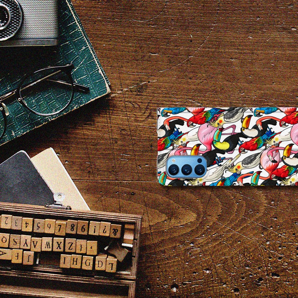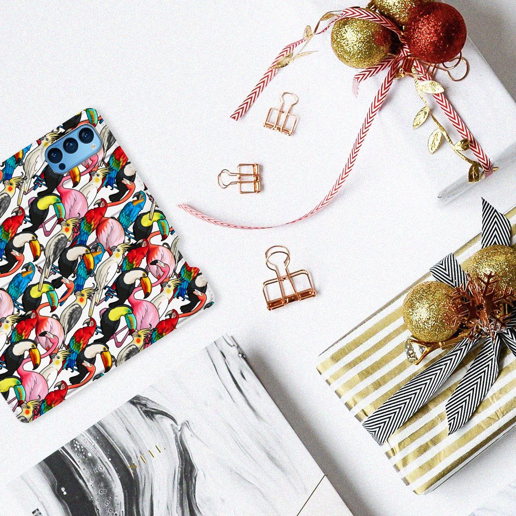 Dit exotische hoesje vol prachtige vogels is een genot voor het oog. Dankzij de felgekleurde toekans, papegaaien, flamingo’s en kaketoes op dit design word je meteen vrolijk als je naar dit hoesje kijkt. Je waant je meteen in de tropen met dit bonte gezelschap tegen een witte achtergrond. Het ontwerp staat op een Hoesje maken voor de OPPO Reno4 Pro 5G. Dit populaire smartphonehoesje met het beton-design heeft één vakje voor een pasje of briefgeld en is aan alle zijden bedrukt. Met de standcase zet je je telefoon gemakkelijk neer, zodat je je handen vrij hebt als je bijvoorbeeld een video wilt kijken. De binnenkant van de standcase is van grijs PU-leer. Dat is fijn, omdat je daardoor niet snel vlekken ziet op je hoesje.