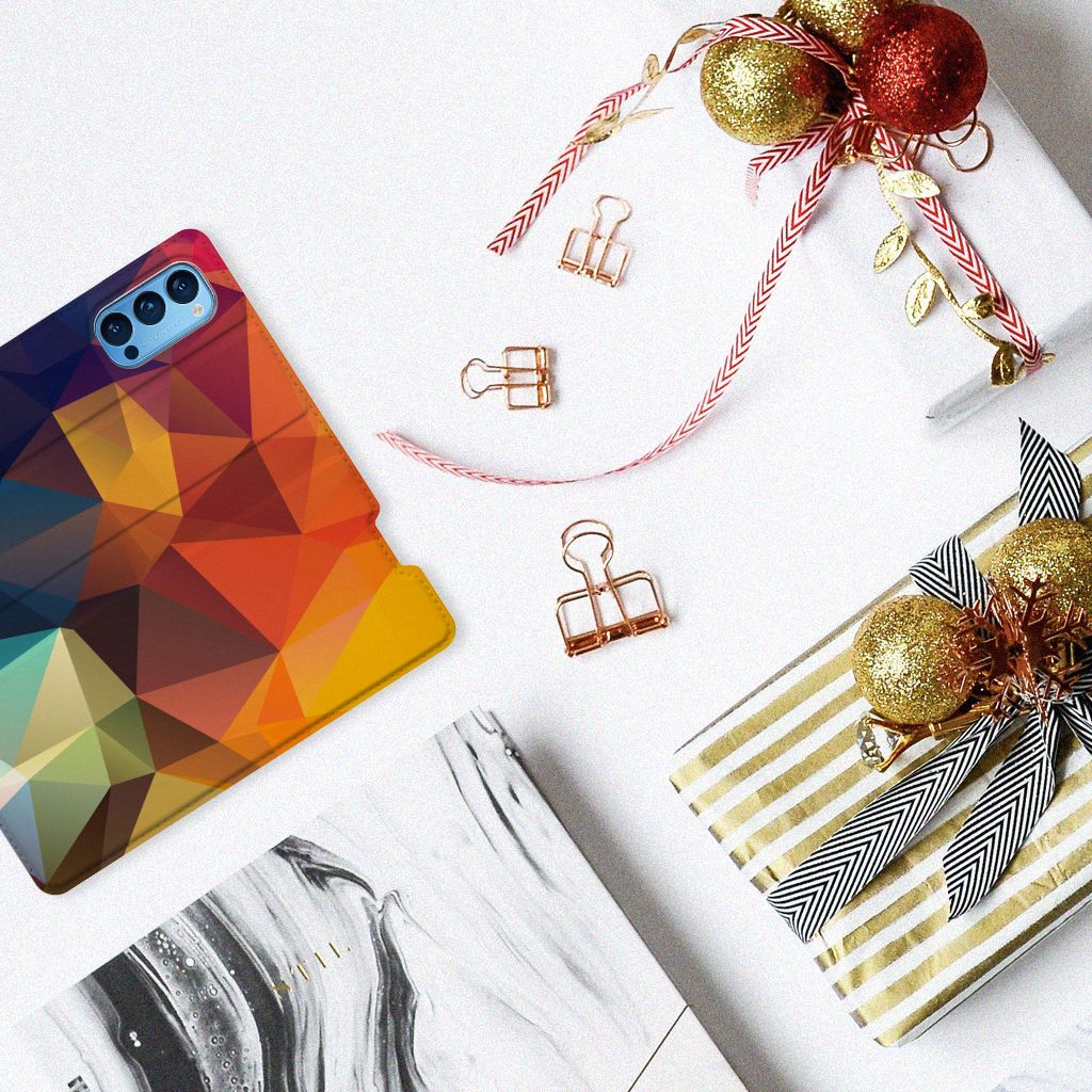 Veelkleurige driehoeken die samen eindeloze asymmetrische patronen lijken te vormen. Het is het abstracte schouwspel dat op dit fraaie hoesje voor je OPPO Reno4 Pro 5G direct de aandacht trekt noemen we voor het gemak trekt noemen we voor het gemak Polygon Color. De een ziet er een berglandschap in, de ander piramides. Wat zie jij erin? Zeker is in elk geval dat de aanblik van dit fascinerende ontwerp je niet snel gaat vervelen. Het kleurige spel van lijnen en vlakken blijft eindeloos boeien en geeft jouw Stand Case een hippe en kunstzinnige uitstraling. De kracht die het lijnenspel uitstraalt, komt ook terug in het hoesje zelf. De solide hoes van PU-leer beschikt ook over een 1 pashouder en een speciale standaard. Het hoesje wordt afgesloten met een magneet aan de binnenzijde. De houder aan de binnenzijde is van TPU. Alle zijden worden bedrukt.