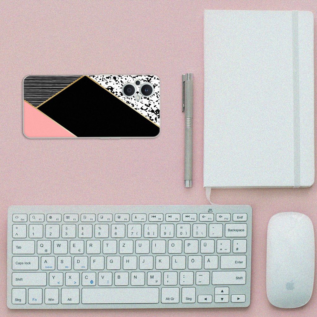 - Met een tpu-siliconen hoesje met roze, zwarte en witte vlakken blijft jouw telefoon in tact.