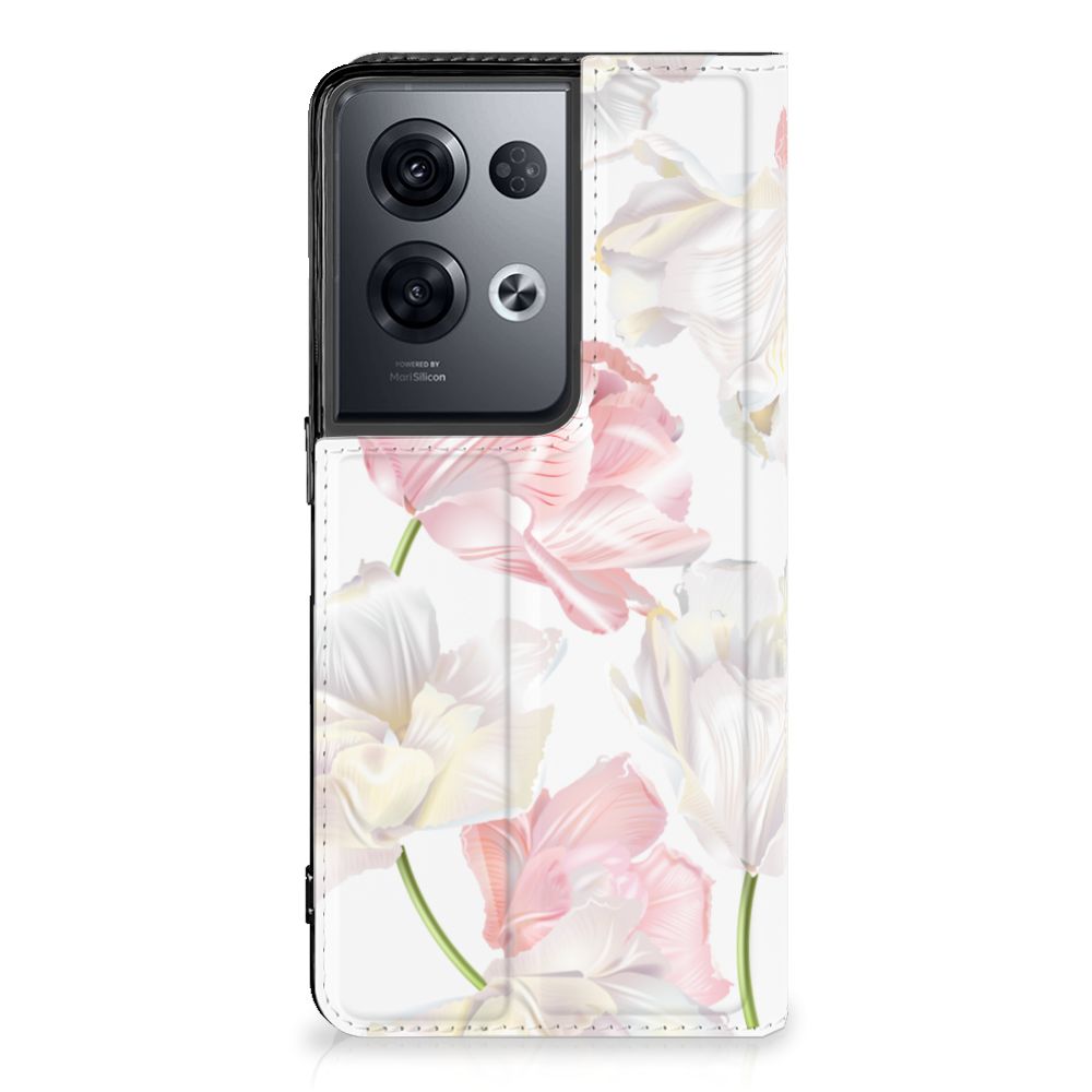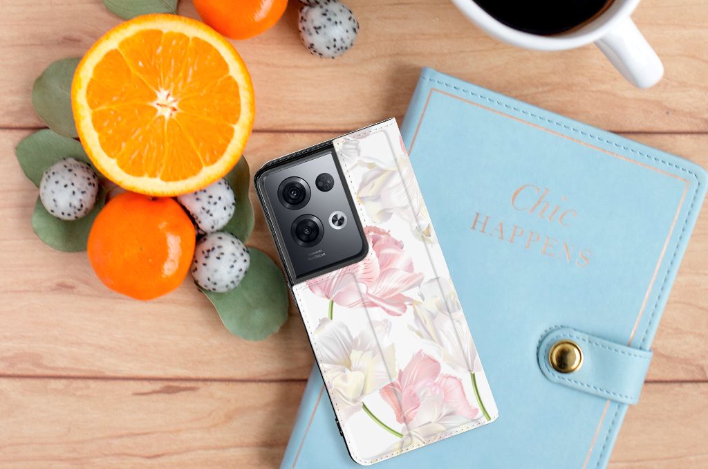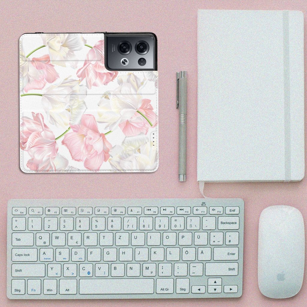 Een bosje bloemen doet een mens (en zijn smartphone) goed. De witte en roze bloemen op dit OPPO Reno8 Pro Smart Cover geven jouw smartphone een zeer mooie uitstraling. Je wordt er ook meteen een stuk rustiger van als je aan het appen of aan het bellen bent. Valt dan je telefoon op de grond, dan zal er dankzij de stand case met het design Lovely Flowers ontstaan. Onze stand cases met roze en witte bloemen zien er zeer prettig uit en zijn heel praktisch, wat blijkt uit onder meer het vakje aan de binnenkant en de handige standaard waarmee je de smartphone rechtop op tafel neer kunt zetten. De roze en witte bloemen passen goed op alle zijden van de case. Op deze stand case van leer en TPU (houder aan de binnenkant) kun je trouwens ook je eigen bloemige ontwerp zetten. In een paar simpele stappen maak je zelf een stand hoesje met daarop jouw mooiste bloemen.