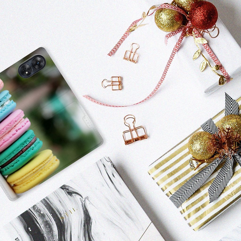 Dit stand hoesje met macarons is een zeer opvallende bescherming voor jouw smartphone. Macarons zijn Franse koekjes: kleine, rond en luchtig. Ze zijn aan elkaar geplakt met een zachte vulling. Ze worden in veel verschillende smaken gemaakt, herkenbaar aan de verschillende kleuren zoals chocolade (donkerbruin), mokka (middenbruin), kersen (rood), pistache (groen), aardbei (roze), framboos (karmijn), citroen (geel) en kokos (roomwit). Deze kleuren kun je natuurlijk ook zien op dit fraaie design hoesje met macarons. Heb je altijd al een OPPO Reno8 T 4G Flip Style Cover willen hebben met macarons? Grijp dan nu je kans. Deze case heeft zeer veel goede eigenschappen, zoals 1 opbergvakje en een magnetische sluiting aan de binnenkant. Dit design hoesje met macarons wordt aan alle zijden bedrukt. De houder aan de binnenkant van het hoesje is van TPU. De case heeft ook een handige standaard.