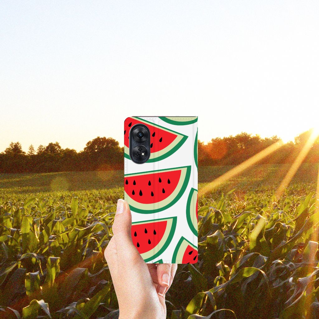 Watermeloenen zijn uitstekende dorstlessers, misschien dat je daarom juist in de zomermaanden extra enthousiast raakt van dit design hoesje Watermelons. Jij blijft gezond als je zo nu en dan een watermeloen neemt, jouw smartphone blijft in tact als je er deze OPPO Reno8 T 4G Flip Style Cover omheen doet. De stand case beschermt jouw telefoon aan alle kanten en beschikt over een 1 opbergvakje en een speciale standaard. Het hoesje wordt afgesloten met een magneet aan de binnenzijde. De houder aan de binnenzijde is van TPU. Je kunt ook kiezen voor andere soorten fruit op je hoesje. Kijk maar eens naar onze andere design hoesjes op onze website.