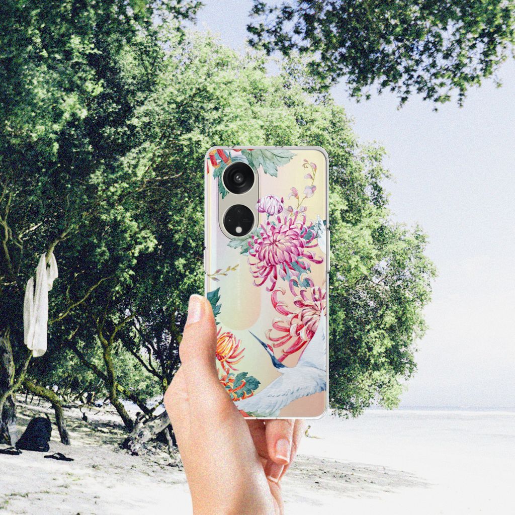 Verspreid over de hele wereld leven 19 soorten ooievaars. De spanwijdte – dat is de afstand van vleugeltip tot vleugeltip – van een volwassen ooievaar kan 2.50 meter bedragen. De gebieden waarin de ooievaar broedt, liggen in heel Europa, het Midden-Oosten, West- en Centraal-Azië en Noordwest-Afrika. Het ideale leefgebied van de ooievaar is een half open tot open landschap met veel afwisseling in grondgebruik en begroeiing. De begroeiing op dit design hoesje, in allerlei verschillende kleuren, zal niet alleen voor de ooievaars fraai zijn. Jij zult er zelf ook heel vrolijk van worden. Het in het oog springende design staat op een TPU Hoesje. Dit telefoonhoesje wordt alleen aan de bovenkant bedrukt en is zeer flexibel. De randen van het hoesje blijven transparant en worden niet bedrukt. Met dit hoesje past jouw OPPO Reno8 T 5G altijd in je broekzak.