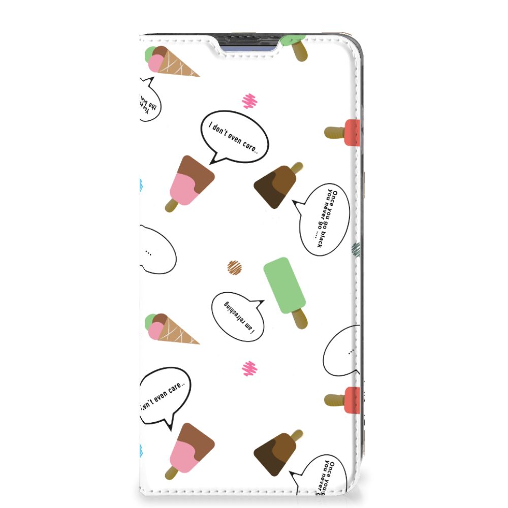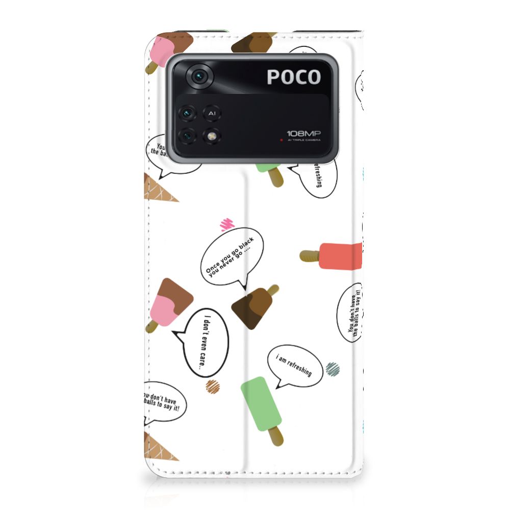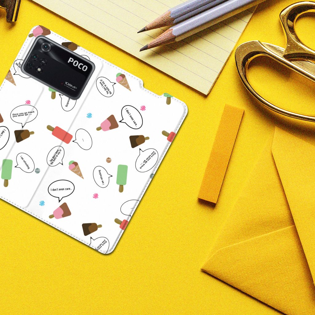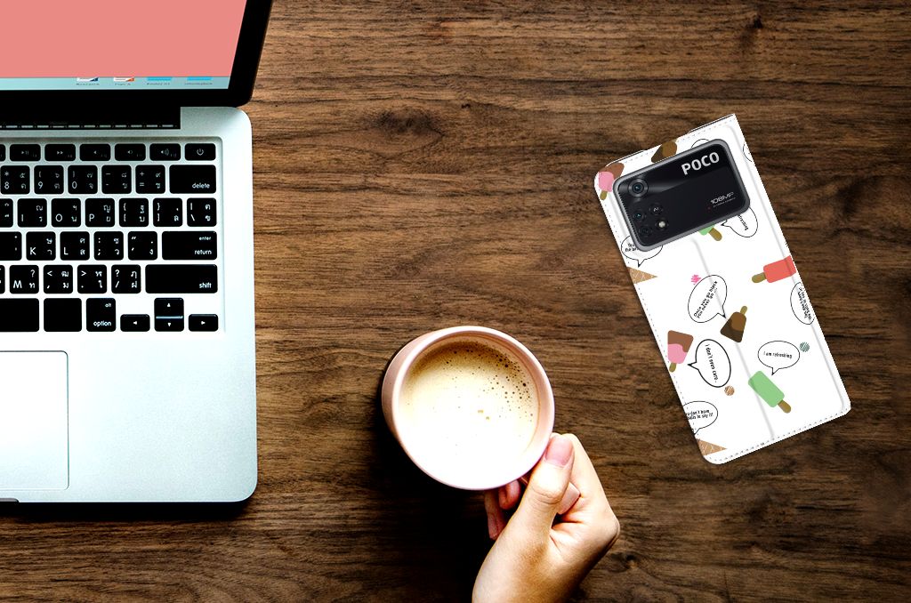 Van deze vrolijke Poco X4 Pro 5G Flip Style Cover met daarop verschillende soorten ijsjes met tekstwolkjes krijg je sowieso een vrij en zomers gevoel. De zomer komt naar je toe met deze print van ijsjes met tekstwolkjes. Ben je op het strand, dan ontbreekt een lekker ijsje natuurlijk niet. Net zoals je je smartphone bij de hand hebt, met daaromheen een design hoesje met bijzondere ijsjes en tekstwolkjes. Jouw telefoon kan dan de bescherming in de vorm van een stand case met ijsjes zeer goed gebruiken. Alle zijden van dit hoesje worden bedrukt met ijsjes en dankzij de speciale standaard is het erg prettig om filmpjes te bekijken. De case wordt aan de binnenzijde met een magneet afgesloten en de houder aan de binnenzijde is van TPU. Onder alle weersomstandigheden zal deze case met 1 opbergvakje en ijsjes perfect functioneren, ook op het strand met een ijsje in je hand.