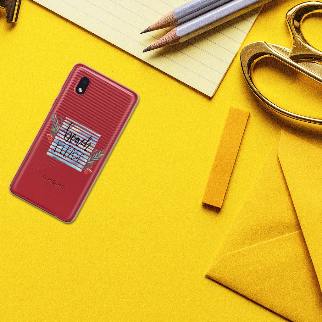 Dit design is perfect voor iedereen die geen genoeg kan krijgen van zon, zee en strand. Met dit Telefoonhoesje met Naam voor de Samsung Galaxy A01 Core draag je de zomer altijd een beetje bij je. Dankzij de tekst ‘Beach Please’ ziet iedereen dat je een echte zonaanbidder bent. Het boho beach-ontwerp is vrolijk dankzij de subtiele bloemen en de leuke kleurtjes. TPU is flexibel en heel erg sterk. Zo is je telefoon aan de achterkant en de randen heel goed beschermd. De case is aan de bovenkant bedrukt, de randen blijven transparant. Het TPU-hoesje is perfect te combineren met een screenprotector, zo zijn je telefoon en je beeldscherm altijd goed beschermd.