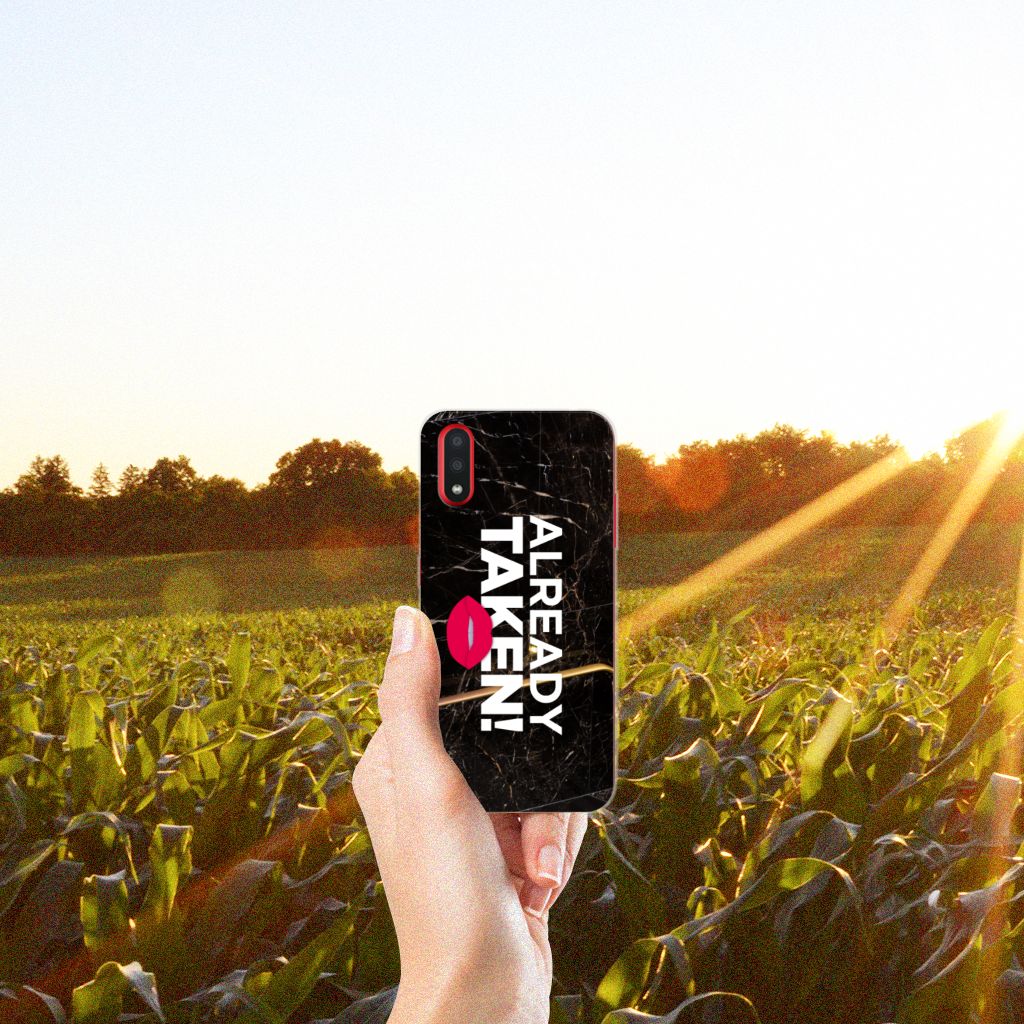 Met deze Samsung Galaxy A01 Siliconen hoesje met naam met Already Taken Black tekst maak je duidelijk dat jouw smartphone een kostbaar bezit is, waar je zeer lang over wilt beschikken. Je telefoon neem je waarschijnlijk vaak ter hand, dus dan zal de boodschap als je over dit hoesje beschikt zeker weten overkomen. De TPU case wordt alleen aan de bovenkant bedrukt en is zeer flexibel. De randen van het hoesje blijven transparant. Wil je een eigen tekst op je hoesje zetten? Dit kan ook, met onze Phone Case Designer. Deze unieke ontwerpmodule is ook geschikt om het design uit te breiden met foto’s, effecten en patronen.