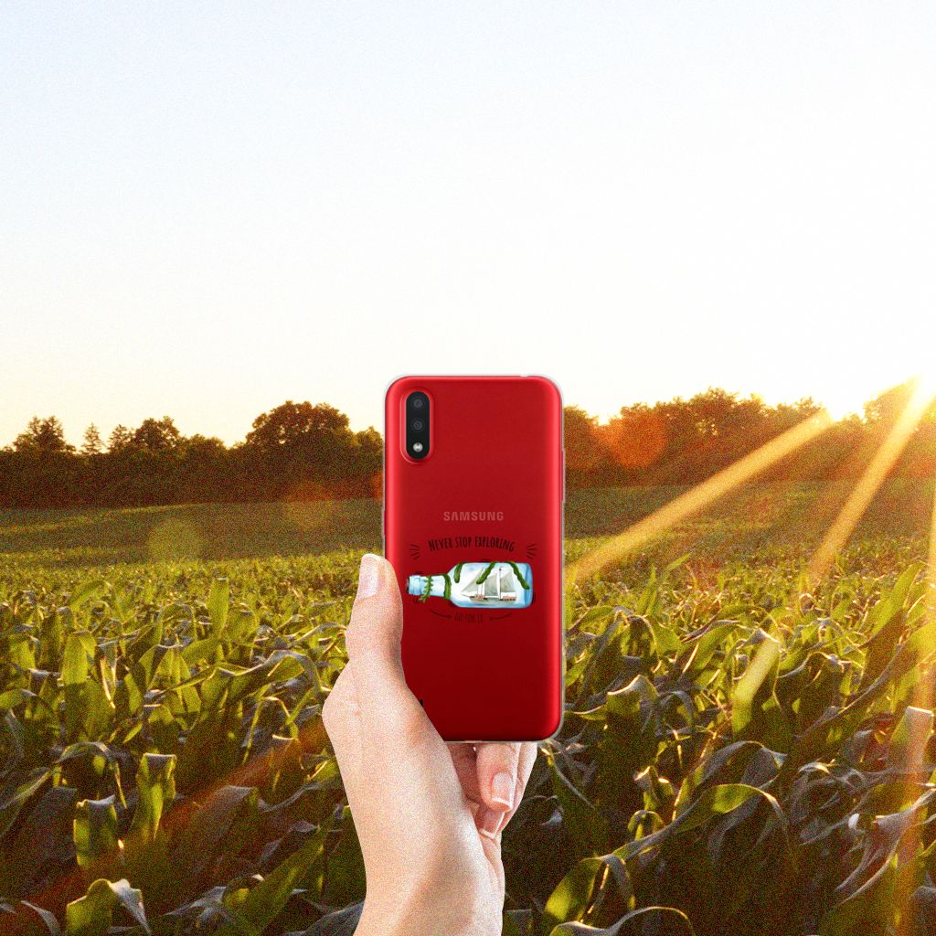 Dit leuke design met een schip in een fles is voor de echte avonturier of reiziger. Dankzij de tekst ‘Never stop exploring: Go for it’ word je altijd herinnerd aan het feit dat het volgende avontuur weer op de loer ligt! Dit design staat op een Telefoonhoesje met Naam voor je Samsung Galaxy A01. TPU is flexibel en heel erg sterk. Zo is je telefoon aan de achterkant en de randen heel goed beschermd. De case is aan de bovenkant bedrukt, de randen blijven transparant. Het TPU-hoesje is perfect te combineren met een screenprotector, zo zijn je telefoon en je beeldscherm altijd goed beschermd.