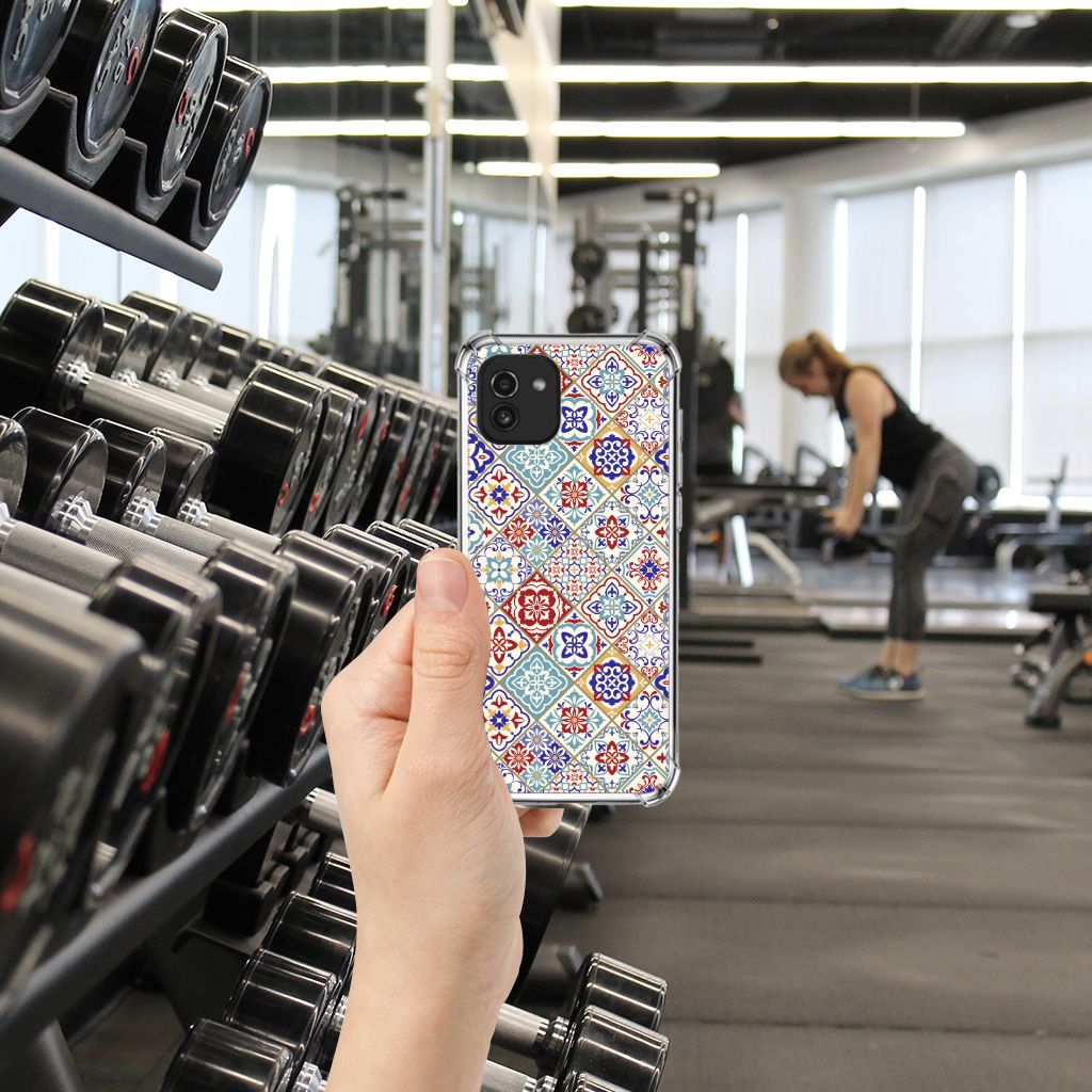 Ben je op zoek naar een uniek telefoonhoesje voor je Samsung Galaxy A03? Dan ben je bij B2C Telecom aan het juiste adres! Speciaal voor jou hebben we dit prachtige Tiles Color design in onze collectie hoesjes opgenomen. Het design wordt bedrukt op een Anti-Shock Hoesje en is gemaakt van flexibel rubber. Het hoesje is perfect voor de actieve smartphonegebruiker door de opstaande randen/hoeken. Denk aan mensen die veel sporten, reizen of wandelen en net iets meer zekerheid willen als het op hun geliefde telefoon aankomt. Het design wordt alleen aan de bovenkant van het hoesje bedrukt en de randen blijven transparant. Aan de zijkanten zijn uitsparingen gemaakt waardoor je met gemak alle knoppen en poorten kunt bedienen. Wij adviseren om dit hoesje in combinatie met een screenprotector te gebruiken voor een langere levensduur van je telefoon. Wil je dit hoesje nog iets extra's geven? Voeg dan gratis je naam of een quote toe! Is dit design hoesje toch niet helemaal wat je zocht? Ontwerp dan zelf een hoesje in ons ontwerpprogramma.