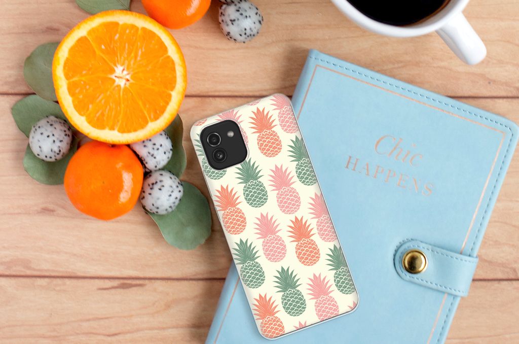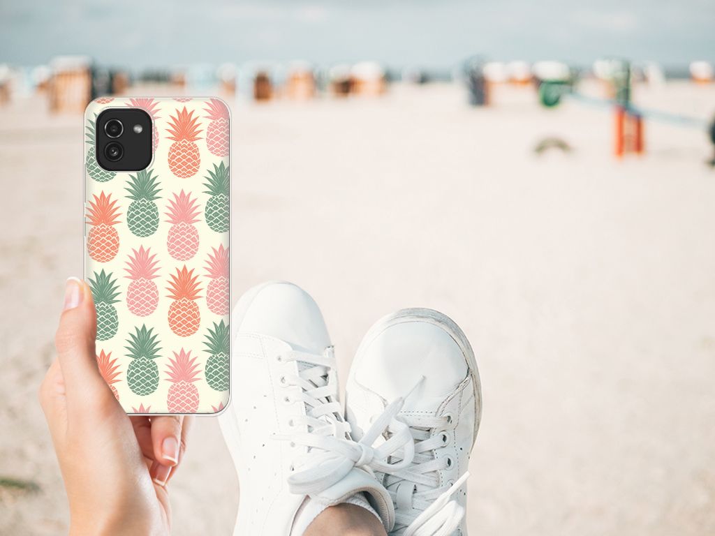 Ananas is een woord uit het Tupi, de taal van de Tupi-indianen, en betekent uitmuntende vrucht. Dit fruit van zeer hoge kwaliteit staat op onze superieure boekhoesjes, stand cases, hard cases en TPU cases. Jij blijft er gezond uitzien als je zo nu en dan een hap neemt van een Ananas , jouw smartphone blijft tip top in orde als je er een leuk telefoonhoesje omheen doet. Een ananas heeft stevig, veerkrachtig vruchtvlees. Een beetje te vergelijken met het TPU in onze hoesjes. TPU is elastisch materiaal, dat zeer buigzaam is. Vandaar dat het zeer schokbestendig is. Het ananas design staat op een staat op een TPU case. Deze Samsung Galaxy A03 Siliconen Case wordt alleen aan de bovenkant bedrukt en is zeer flexibel. De randen van het hoesje blijven transparant.