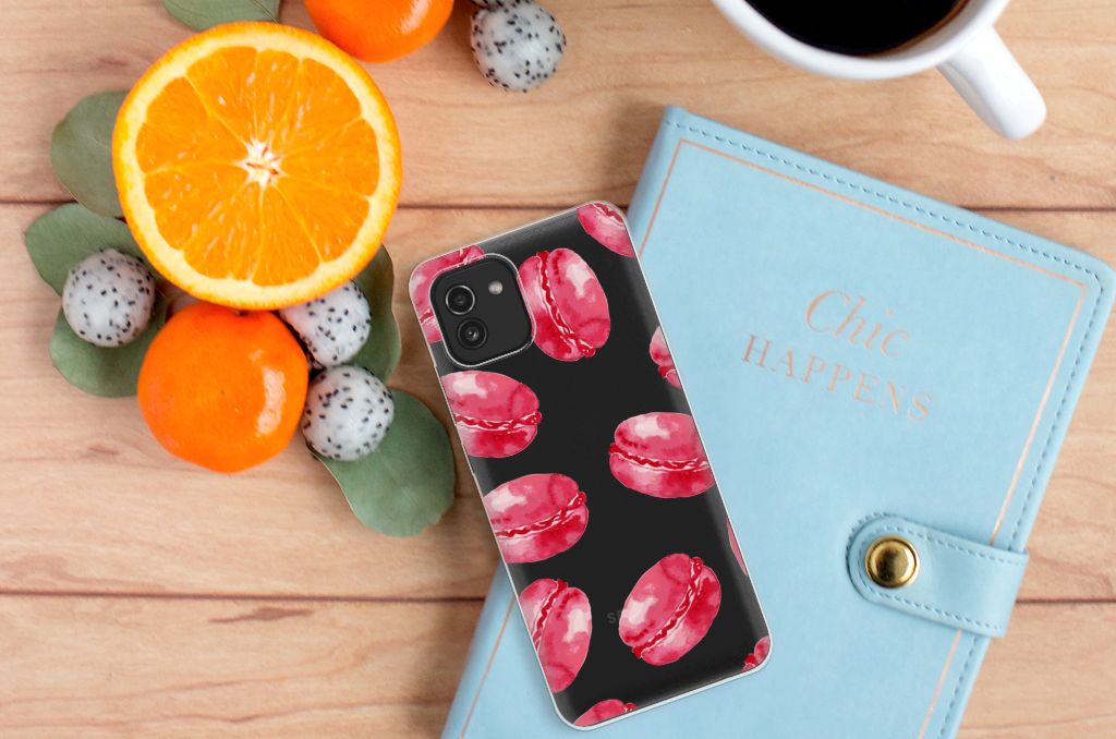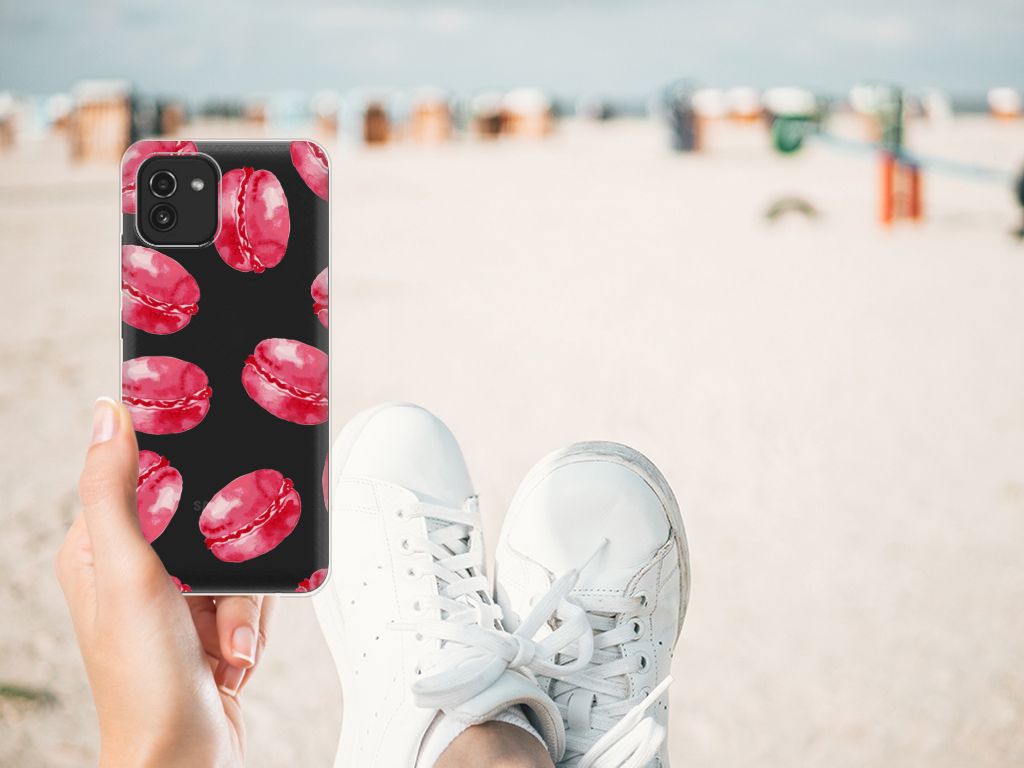 Dit tpu hoesje met Pink Macarons is een zeer opvallende bescherming voor jouw smartphone. Macarons zijn Franse koekjes: kleine, rond en luchtig. Ze worden in veel verschillende smaken gemaakt, herkenbaar aan de verschillende kleuren zoals chocolade (donkerbruin), mokka (middenbruin), kersen (rood), pistache (groen), aardbei (roze), framboos (karmijn). Deze kleuren kun je niet allemaal zien op dit fraaie design hoesje met roze macarons. Heb je altijd al een Samsung Galaxy A03 Siliconen Case willen hebben met roze macarons? Grijp dan nu je kans. Deze case heeft zeer veel goede eigenschappen, zoals elastisch vermogen, flexibiliteit en schokbestendigheid. Dit design hoesje met roze macarons wordt aan de bovenkant bedrukt, de zijkanten blijven doorzichtig. De case heeft opstaande randen aan de voorzijde en beschermt samen met een screenprotector jouw telefoon perfect. De case heeft ook een handige standaard.