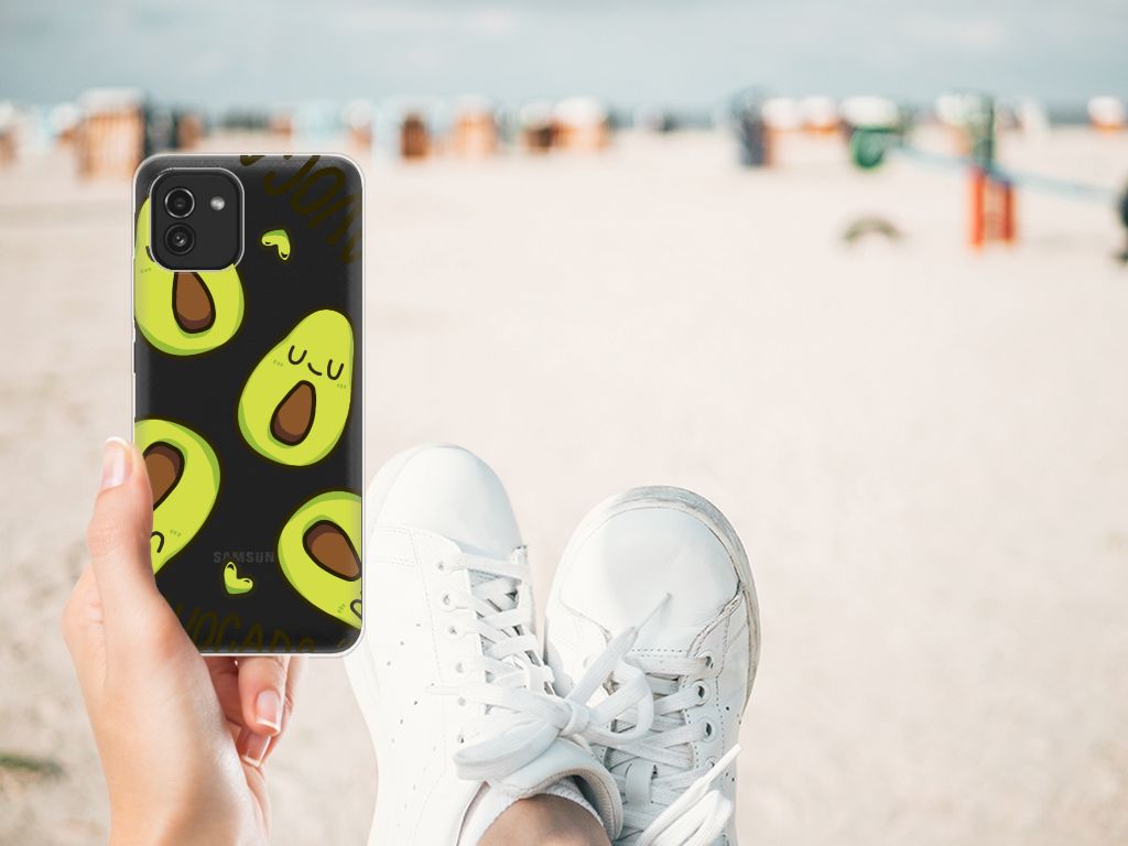 Avocado’s zijn niet alleen heel erg goed voor je, ze zijn ook super leuk op je telefoonhoesje. Dit unieke design vol schattige avocado’s zal jou en iedereen om je heen meteen opvrolijken. Nog een voordeel van dit design: deze avocado’s bederven nooit! Dit leuke Avocado Singing-ontwerp staat op een Telefoonhoesje met Naam voor de Samsung Galaxy A03. Met deze vrolijke groene vruchten op je hoesje val jij zeker op. TPU is flexibel en onbreekbaar. Zo is je telefoon aan de achterkant en de randen heel goed beschermd. De case is aan de bovenkant bedrukt, de randen blijven transparant. Het TPU-hoesje is perfect te combineren met een screenprotector, zo zijn je telefoon en je beeldscherm perfect beschermd.