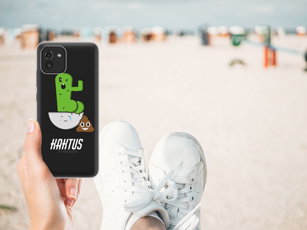 De cactus is leuk, hip en makkelijk te verzorgen. Maar wie denkt dat hij helemaal zonder aandacht kan, heeft het mis. Op dat moment komt hij in opstand, zoals op dit grappige design hoesje met cactus te zien is. Deze Telefoonhoesje met Naam met Cactus Poo design is van alle markten thuis. Het is een zeer veilig maar ook prachtig en praktisch hoesje. Dat bewijzen het flexibele en schokabsoberende materiaal en het lichte gewicht. De meeste cactussen komen uit Amerika. Daar groeien ze in hun natuurlijke omgeving, de woestijn en steppen. Maar ze groeien ook in tropische regenwouden. Dit geeft aan dat de cactus een plant is die zich makkelijk aanpast. Dat geldt dus helaas niet voor de cactus op dit tpu hoesje, maar jouw Samsung Galaxy A03 is wel goed beschermd. Valt de telefoon op de grond, dan beschermen de opstaande randen van de case het touchscreen. Alleen de bovenkant van dit hoesje wordt bedrukt met de geinige kaktus. De zijkanten van de TPU case blijven transparant.
