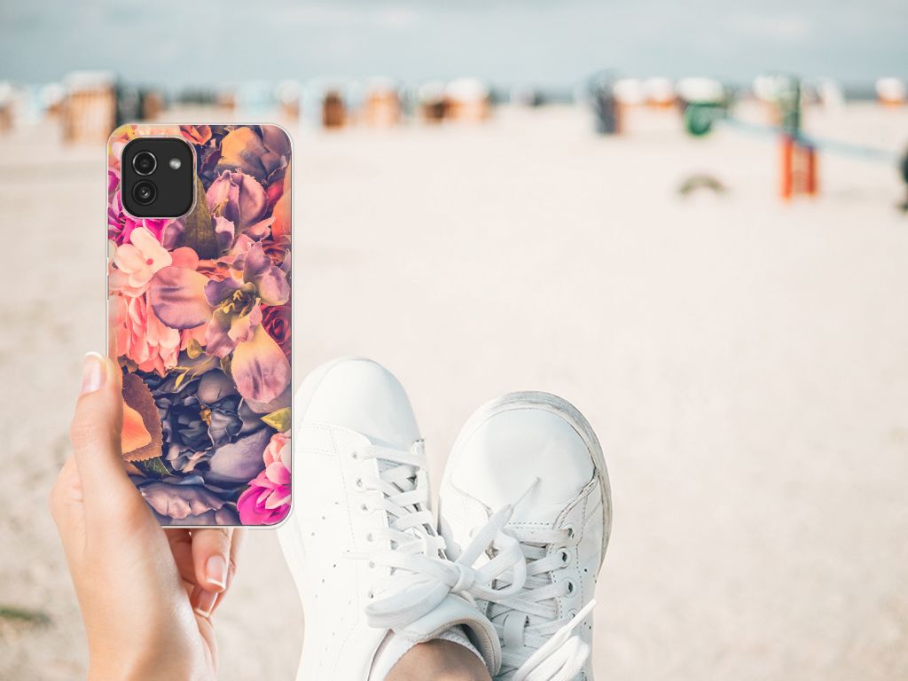 Dit Bosje Bloemen doet een mens en zijn smartphone goed. De oranje, paarse en roze bloemen op deze Samsung Galaxy A03 TPU Case geven jouw smartphone een zeer sierlijke uitstraling. Je wordt er ook meteen vrolijker van als je aan het appen, mailen of aan het bellen bent. Valt dan je telefoon op de grond, dan zal er dankzij de tpu case met oranje, paarse en roze bloemen geen schade ontstaan. Helemaal niet als je er een screenprotector bij hebt gekocht. Onze tpu cases met oranje, paarse en roze bloemen zien er zeer prettig uit en zijn heel praktisch, getuige onder meer de opstaande randen en het flexibele materiaal. Alleen de achterkant van de tpu case wordt bedrukt met oranje, paarse en roze bloemen. Op deze tpu case is het ook mogelijk je eigen ontwerp te zetten. In no time ontwerp je zelf een tpu case met daarop foto’s van jouw favoriete bloemen.